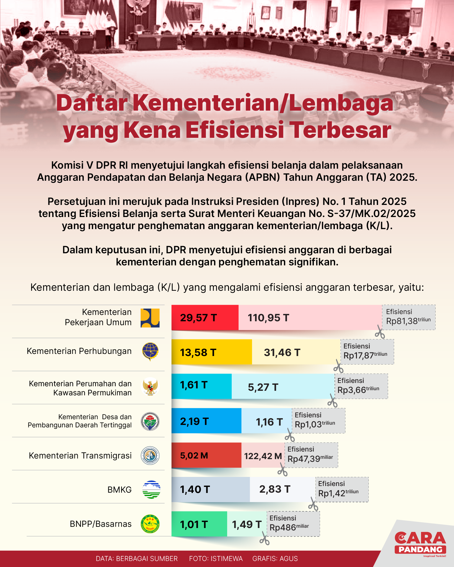 CARAPANDANG - Komisi V DPR RI menyetujui langkah efisiensi belanja dalam pelaksanaan Anggaran Pendapatan dan Belanja Negara (APBN) Tahun Anggaran (TA) 2025.