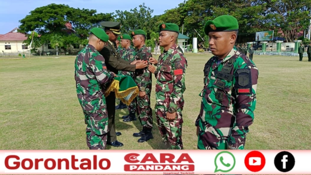 POHUWATO, CARAPANDANG - Komandan Kodim 1313/Pohuwato Letkol Inf Madiyan Surya, Hub. Int., M. Han, memimpin Upacara Wisuda Purna Tugas Bintara dan Korp Raport kenaikan pangkat Bintara dan Tamtama Prajurit Kodim 1313/Pohuwato, yang berjumlah 16 Prajurit di Lapangan Upacara Kodim 1313/Pohuwato. Selasa (1/10/2024).