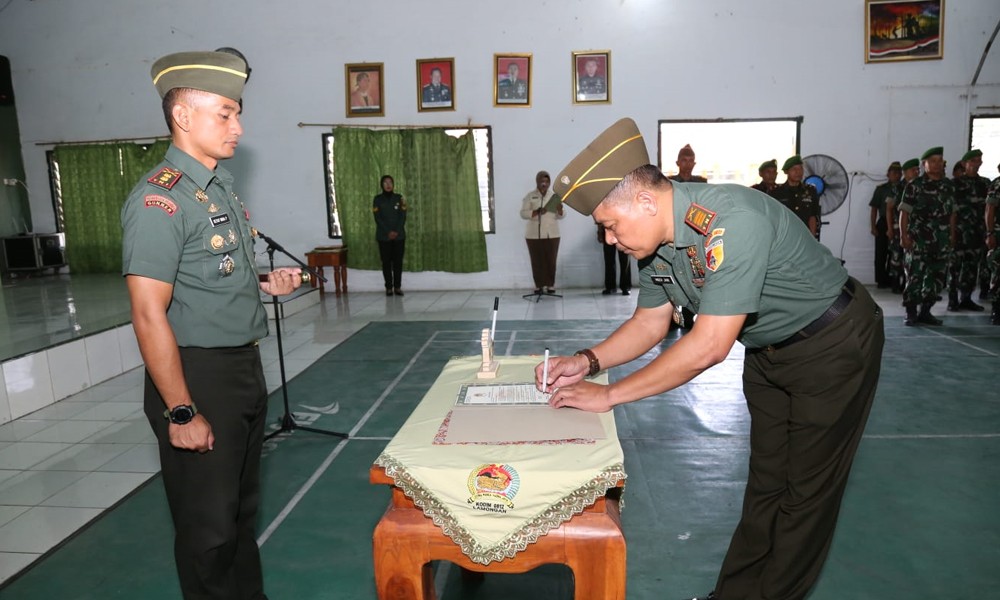 CARAPANDANG - Dandim 0812/Lamongan Letkol Arm Ketut Wira Purbawan memimpin berlangsungnya pelepasan dan penyambutan prajurit di Aula Kadet Soewoko, Makodim 0812/Lamongan. Kamis (14/09/2023).