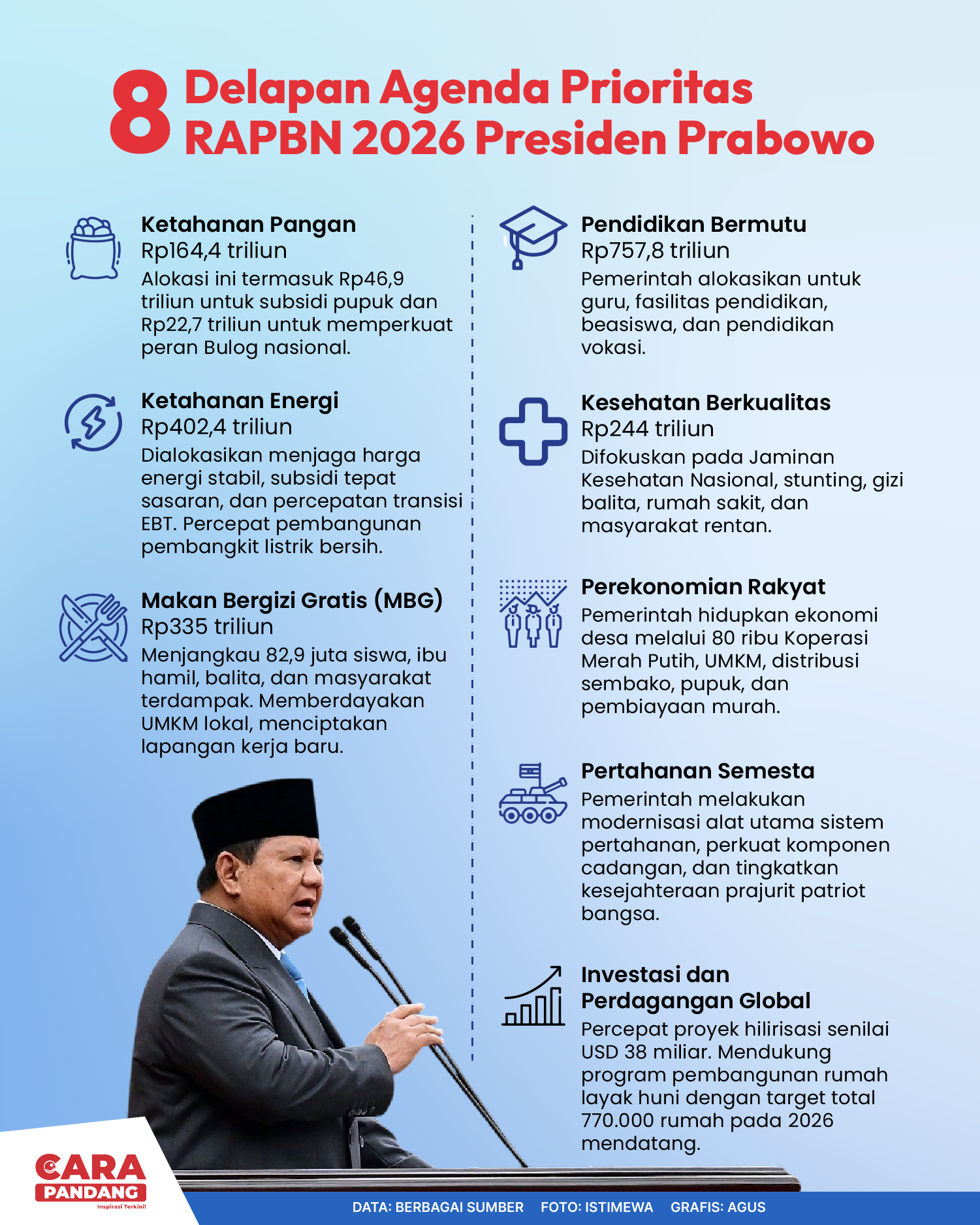 Beranda Infografis Delapan Prioritas Anggaran RAPBN 2026 Infografis Delapan Prioritas Anggaran RAPBN 2026 Penulis Amira Izzati - 17 Agustus 2025 07:48 0 Delapan Prioritas Anggaran RAPBN 2026 Tags Berita Sebelumnya Pemkab Pohuwato Laksanakan Upacara Taptu di Lapangan Makodim 1313 Pohuwato Berita Berikutnya Indonesia Dalam Dilema Misi Perdamaian Dunia LEAVE A REPLY Cancel reply Comment: Please enter your comment! Name:* Please enter your name here Email:* You have entered an incorrect email address! Please enter your email address here Website: Save my name, email, and website in this browser for the next time I comment. Berita Teratas Kisah Ajaib Nabi Sulaiman dan Anak yang Berbakti kepada Orang Tua 8 Cara Merawat Kucing Kesayangan Agar Tubuhnya Selalu Sehat Minuman yang Mampu Redakan Batuk yang Menganggu Manfaat Ajaib Bawang Putih Bagi Kesehatan 8 Cara Menjaga Kesehatan Gigi dan Mulut yang Efektif Berita Terkait Berita Terkait Wajah Baru PP Tunas: Garda Terdepan Perlindungan Anak Indonesia Zoel Rachman - 31 Maret 2026 09:42 MBG 5 Hari Sepekan Masih Wacana Maliq - 30 Maret 2026 11:49 Presiden Ingin Semua Kendaraan Dikonversi ke Listrik Maliq - 30 Maret 2026 11:48 Kewaijiban PSE Terhadap Pengguna Anak Maliq - 30 Maret 2026 11:15