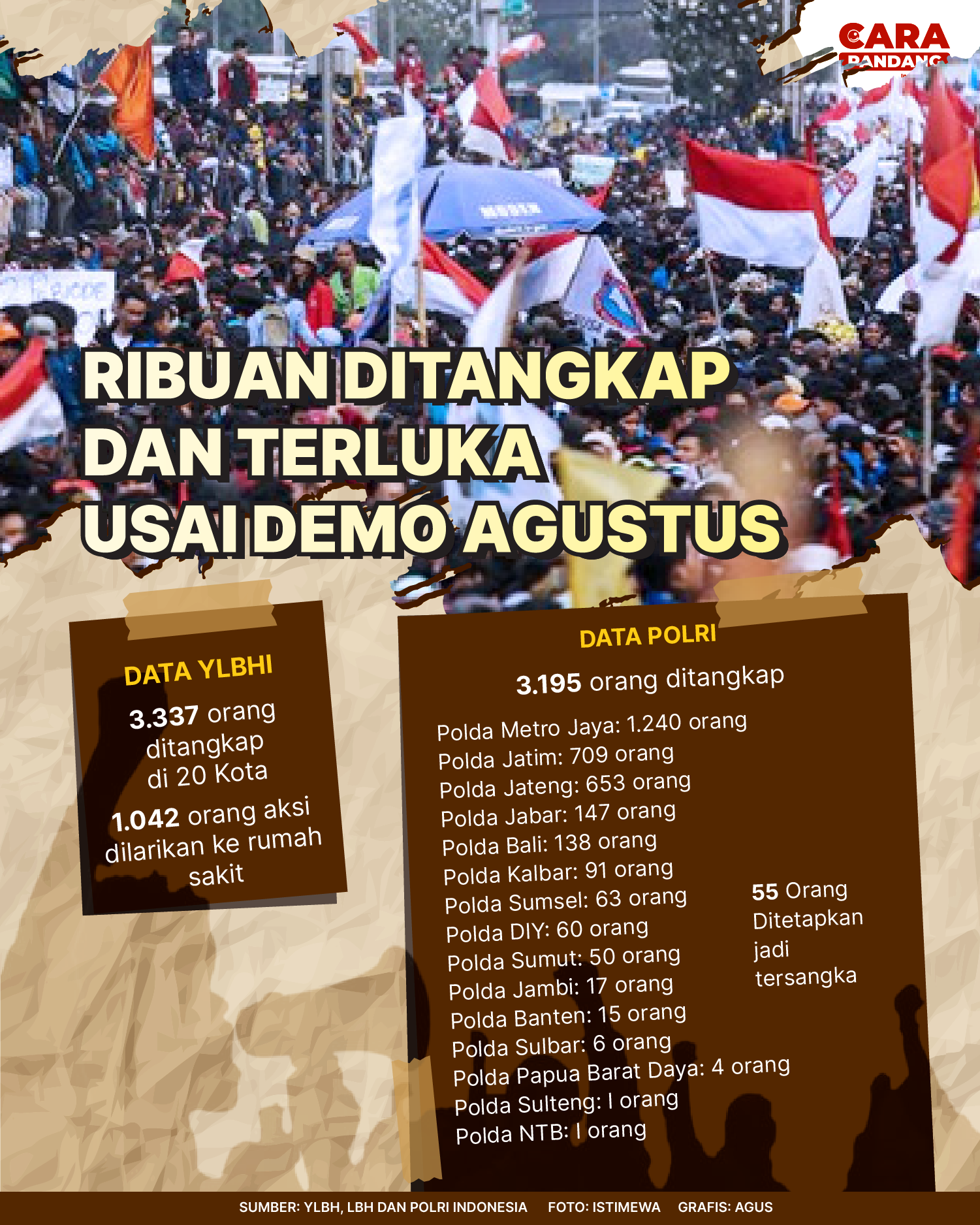 Beranda Infografis Demo Agustus, Ribuan Ditangkap dan Terluka Infografis Demo Agustus, Ribuan Ditangkap dan Terluka Penulis Amira Izzati - 06 September 2025 09:11 0 Demo Agustus, Ribuan Ditangkap dan Terluka Tags Berita Sebelumnya Wamentan: Inovasi Pupuk Indonesia yang Bikin Petani Panen Melimpah Berita Berikutnya Indonesia Dalam Dilema Misi Perdamaian Dunia LEAVE A REPLY Cancel reply Comment: Please enter your comment! Name:* Please enter your name here Email:* You have entered an incorrect email address! Please enter your email address here Website: Save my name, email, and website in this browser for the next time I comment. Berita Teratas Kisah Ajaib Nabi Sulaiman dan Anak yang Berbakti kepada Orang Tua 8 Cara Merawat Kucing Kesayangan Agar Tubuhnya Selalu Sehat Minuman yang Mampu Redakan Batuk yang Menganggu Manfaat Ajaib Bawang Putih Bagi Kesehatan 8 Cara Menjaga Kesehatan Gigi dan Mulut yang Efektif Berita Terkait Berita Terkait Wajah Baru PP Tunas: Garda Terdepan Perlindungan Anak Indonesia Zoel Rachman - 31 Maret 2026 09:42 MBG 5 Hari Sepekan Masih Wacana Maliq - 30 Maret 2026 11:49 Presiden Ingin Semua Kendaraan Dikonversi ke Listrik Maliq - 30 Maret 2026 11:48 Kewaijiban PSE Terhadap Pengguna Anak Maliq - 30 Maret 2026 11:15