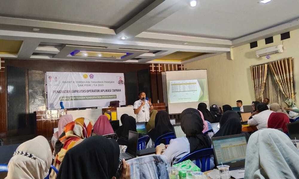 POHUWATO, CARAPANDANG.COM - Dalam rangka Rapat Koordinasi Tanaman Pangan Guna Penguatan Sistem Informasi Tanaman Pangan dan Holtikultura (TAPARA) serta Evaluasi Pemanfaatan Alsintan Pasca Panen TP Tahun 2023, maka Dinas Pertanian Kabupaten Pohuwato menggelar kegiatan Penguatan Kapasitas bagi Operator Desa Aplikasi Tapara, Rabu (25/10/2023), bertempat di Aula Dinas PUPR Pohuwato.
