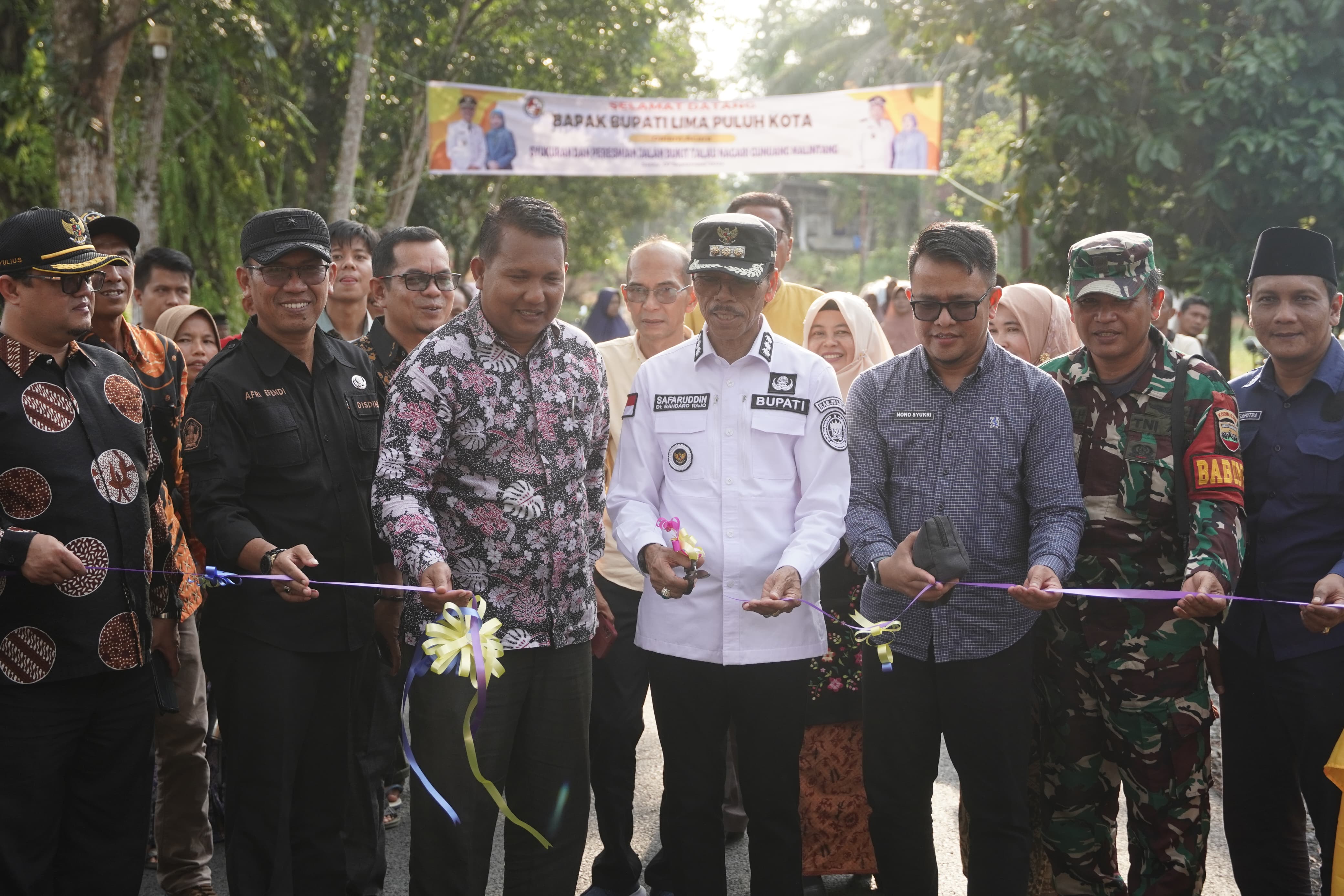 LIMA PULUH KOTA, CARAPANDANG - Ditandai dengan pengguntingan pita oleh Bupati Lima Puluh Kota, Safaruddin Dt.Bandaro Rajo, Masyarakat Jorong Bukit Talao, Nagari Gunuang Malintang, Kecamatan Pangkalan akhirnya dapat menikmati jalan mulus dari kampung mereka menuju pusat nagari maupun menuju ruas jalan provinsi Pangkalan-Kapur IX. Berpuluh tahun jalan sepanjang 4 KM itu diharapkan masyarakat Bukit Talao untuk segera di 'aspal beton' akhirnya di tahun 2024 ini dapat terealisasi. Sebagai Bentuk syukur atas diwujudkannya keinginan warga kepada Pemerintah Daerah Kabupaten Limapuluh Kota, Masyarakat Bukik Talao menggelar syukuran pada Sabtu, (07/09/2024).