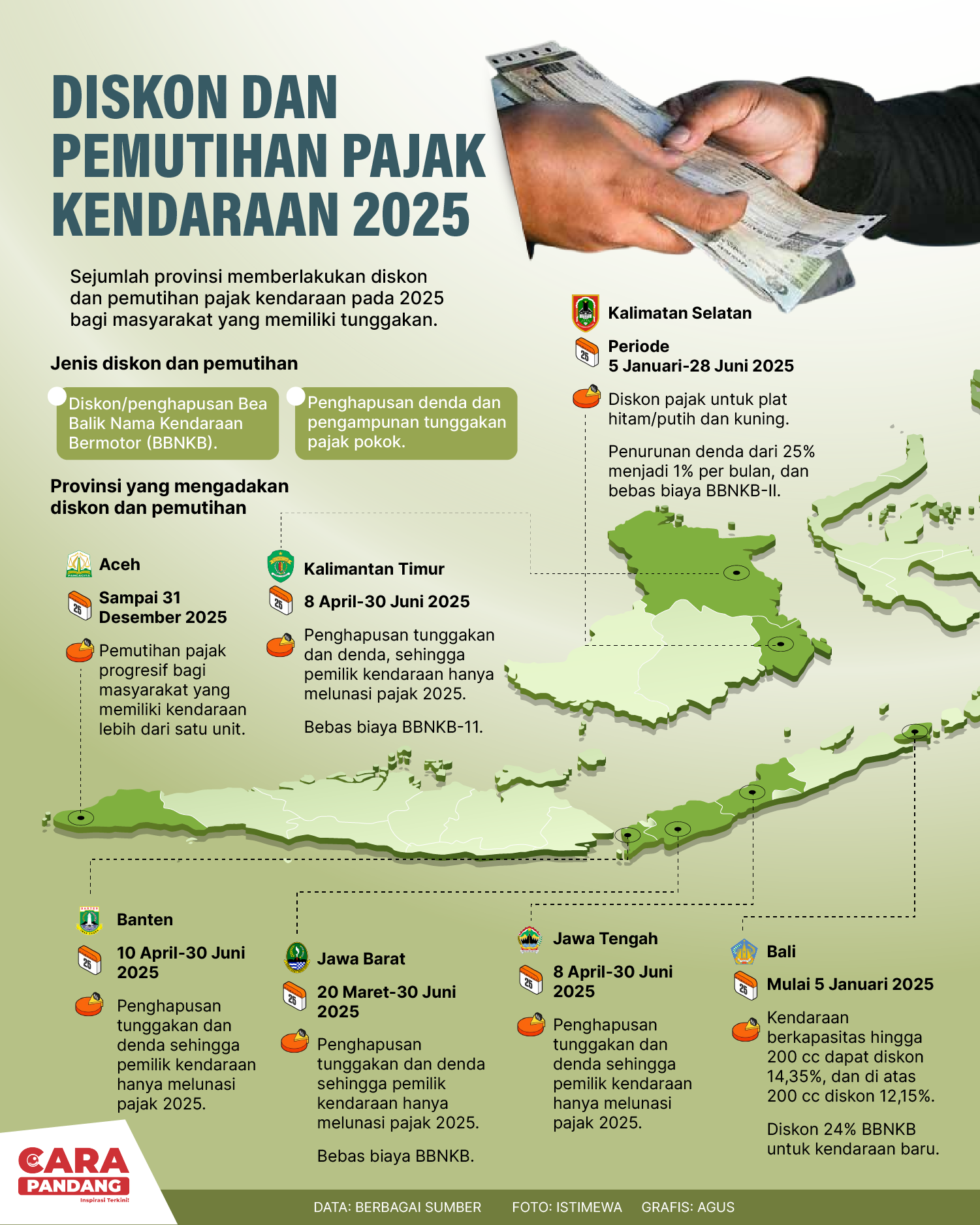 Beranda Infografis Diskon dan Pemutihan Pajak Kendaraan 2025 Infografis Diskon dan Pemutihan Pajak Kendaraan 2025 Diskon dan Pemutihan Pajak Kendaraan 2025. Penulis Rais Syauqi - 15 April 2025 05:39 0 CARAPANDANG.COM - Diskon dan Pemutihan Pajak Kendaraan 2025. Tags Infografik Berita Sebelumnya Om Zet Ajak Siswa SMPN 8 Payakumbuh Terapkan Pola Hidup Sehat dan Peduli Lingkungan Berita Berikutnya Indonesia Dalam Dilema Misi Perdamaian Dunia LEAVE A REPLY Cancel reply Comment: Please enter your comment! Name:* Please enter your name here Email:* You have entered an incorrect email address! Please enter your email address here Website: Save my name, email, and website in this browser for the next time I comment. Berita Teratas Kisah Ajaib Nabi Sulaiman dan Anak yang Berbakti kepada Orang Tua 8 Cara Merawat Kucing Kesayangan Agar Tubuhnya Selalu Sehat Minuman yang Mampu Redakan Batuk yang Menganggu Manfaat Ajaib Bawang Putih Bagi Kesehatan 8 Cara Menjaga Kesehatan Gigi dan Mulut yang Efektif Berita Terkait Berita Terkait Wajah Baru PP Tunas: Garda Terdepan Perlindungan Anak Indonesia Zoel Rachman - 31 Maret 2026 09:42 MBG 5 Hari Sepekan Masih Wacana Maliq - 30 Maret 2026 11:49 Presiden Ingin Semua Kendaraan Dikonversi ke Listrik Maliq - 30 Maret 2026 11:48 Kewaijiban PSE Terhadap Pengguna Anak Maliq - 30 Maret 2026 11:15