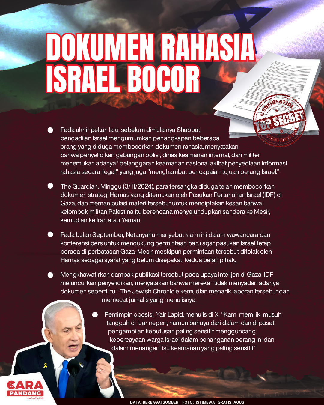 CARAPANDANG - Perdana Menteri Israel Benjamin Netanyahu kini berada di tengah badai politik terkait kesepakatan sandera dalam perang Gaza setelah penangkapan beberapa orang yang diduga membocorkan dokumen rahasia dari kantornya.