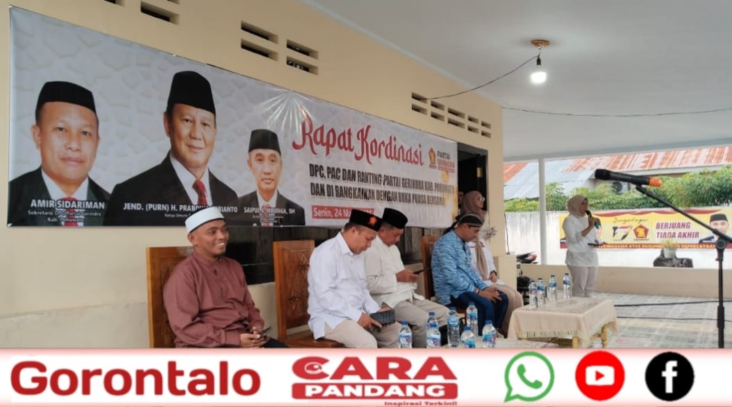 POHUWATO, CARAPANDANG - Dewan Pimpinan Cabang DPC) Partai Gerakan Indonesia Raya (Gerindra) Kabupaten Pohuwato menggelar Rapat Koordinasi bersama DPC, PAC dan Ranting dirangkaikan dengan Buka Puasa Bersama di Sekretariat Pemenangan SIAP, Marisa Selatan, Senin (24/03/2025).