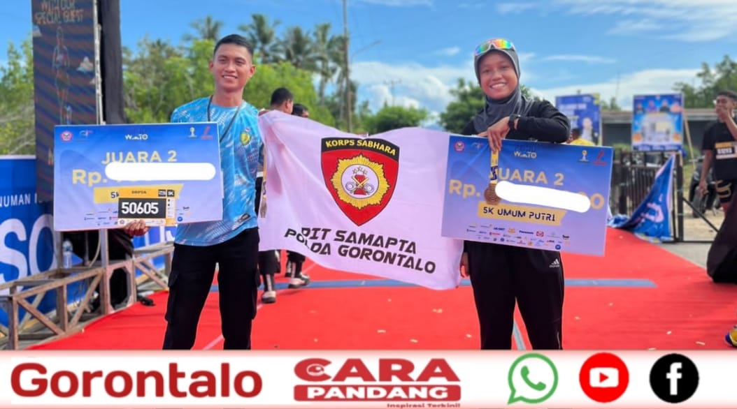 POHUWATO, CARAPANDANG - Dua anggota Polri dari satuan Samapta Polda Gorontalo menunjukkan performa membanggakan dalam ajang Half Marathon Pohuwato 2025 yang digelar Sabtu (14/06/2025) di Pelataran Pantai Pohon Cinta, Kabupaten Pohuwato. Keduanya sukses mengukir prestasi di kategori 5 kilometer umum putra dan putri.