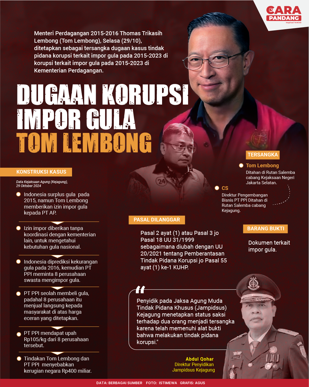 CARAPANDANG - Mantan Menteri Perdagangan Thomas Trikasih Lembong ditetapkan sebagai tersangka oleh Kejaksaan Agung (Kejagung) atas dugaan korupsi impor gula pada Selasa (29/10).