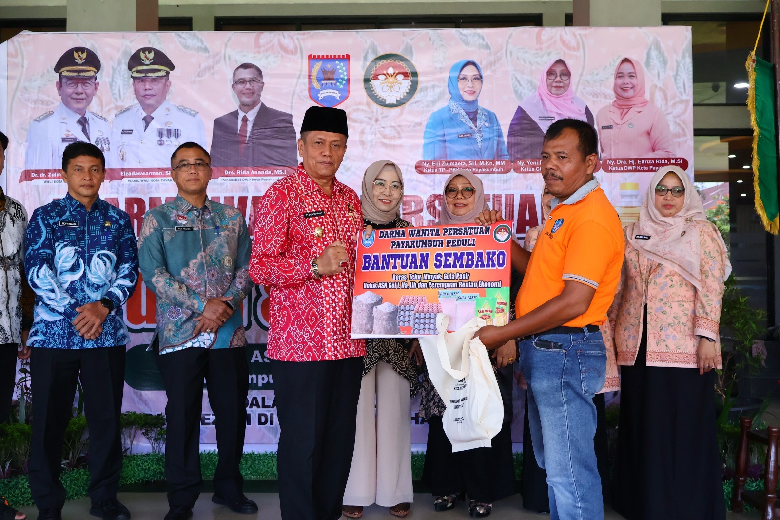 PAYAKUMBUH, CARAPANDANG - Wakil Wali Kota Payakumbuh Elzadaswarman menyerahkan secara simbolis paket sembako kepada pekerja rentan ekonomi dalam program Dharma Wanita Persatuan (DWP) Kota Payakumbuh Berbagi dan Peduli, yang digelar di Lobi Balai Kota Payakumbuh, Kamis (12/3/2026) pagi.