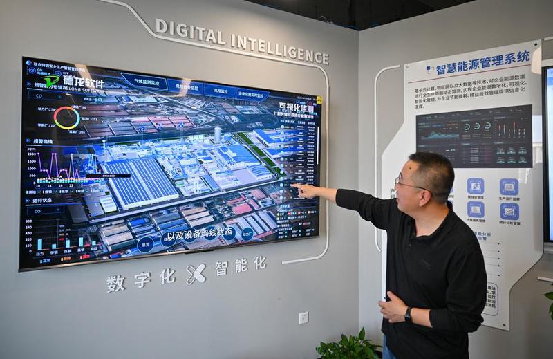 Seorang staf memperkenalkan perangkat lunak monitor yang diaplikasikan untuk produksi industri di sebuah perusahaan perangkat lunak di Tianjin, China utara, pada 18 April 2025. (Xinhua/Sun Fanyue)