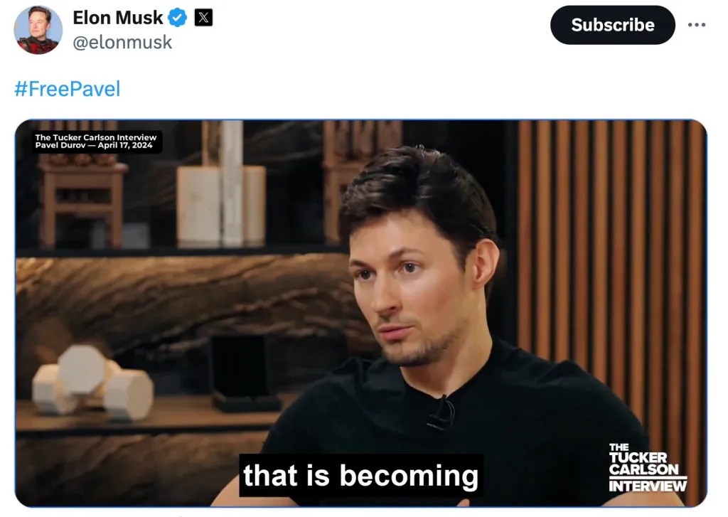 Musk kemudian menulis “#FreePavel” pada X, beberapa jam setelah Pavel ditangkap di bandara Le Bourget, yang dilaporkan atas tuduhan bahwa ia membiarkan aktivitas kriminal berkembang di aplikasi perpesanan terenkripsi miliknya.