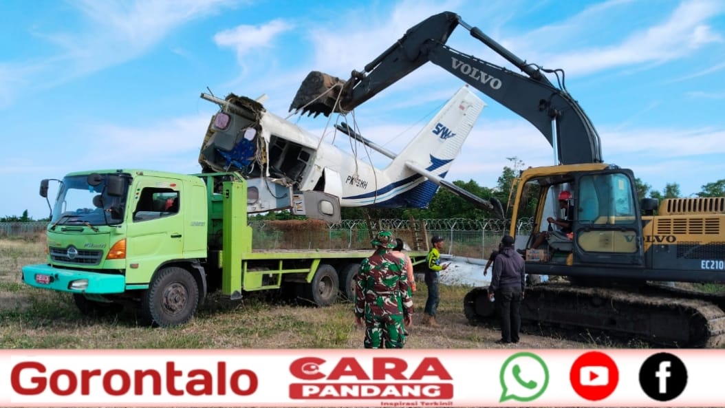 Puing-puing pesawat yang telah dievakuasi sementara akan disterilkan di halaman Bandara Panua Kabupaten Pohuwato.