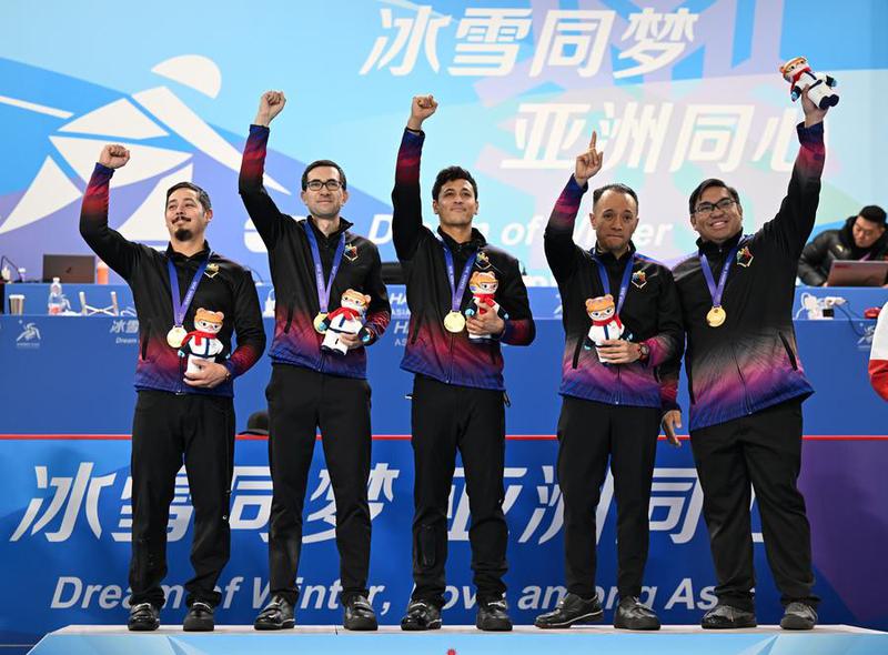 Christian Haller, Alan Frei, Marc Pfister, dan Enrico Pfister (dari kiri ke kanan) dari Filipina merayakan kemenangan setelah merebut medali emas curling putra melawan Korea Selatan pada Asian Winter Games kesembilan di Harbin, Provinsi Heilongjiang, China timur laut, pada 14 Februari 2025. (Xinhua/Li Jianan)
