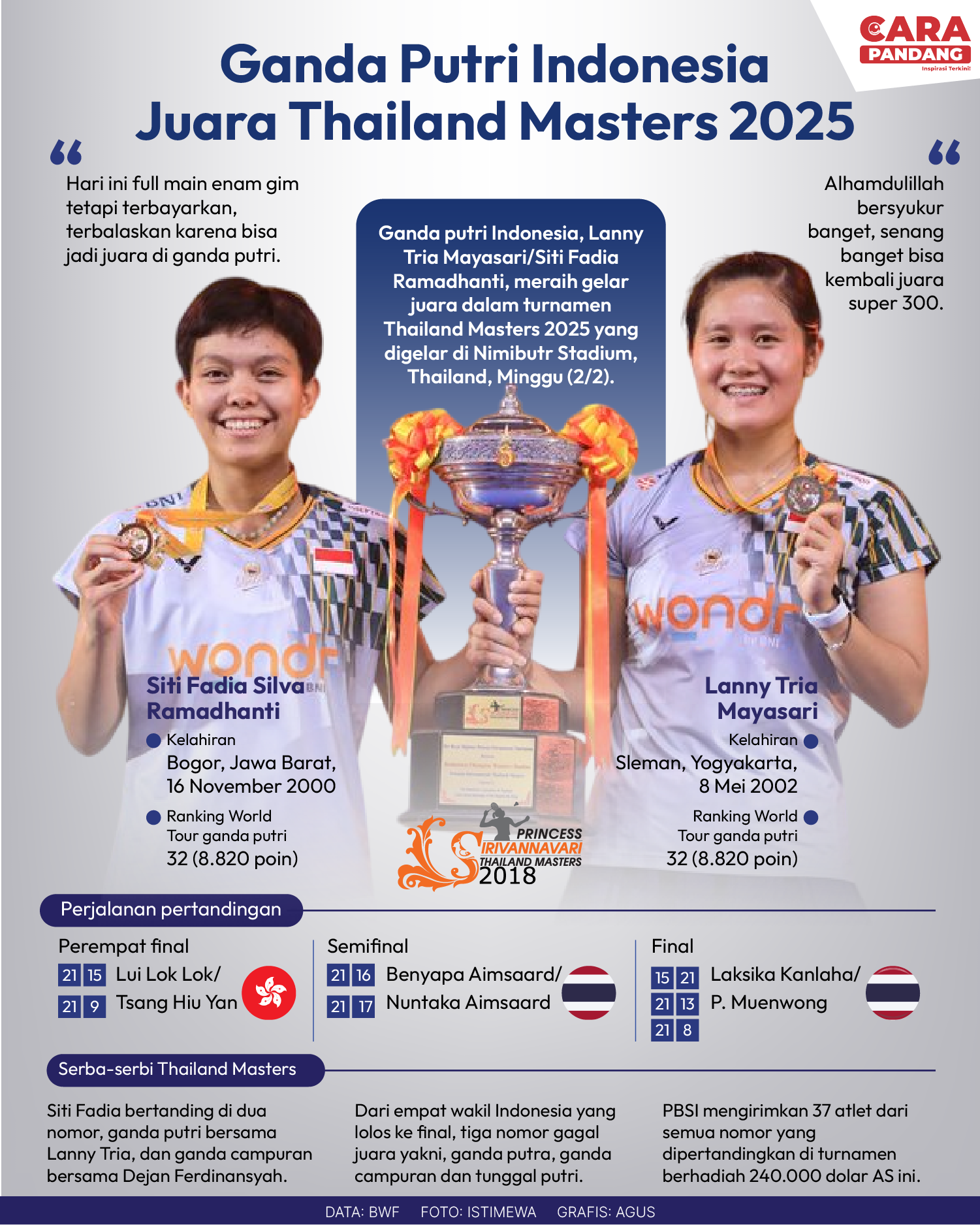 Beranda Infografis Ganda Putri Indonesia Juara Thailand Masters 2025 Infografis Ganda Putri Indonesia Juara Thailand Masters 2025 Penulis Amira Izzati - 04 Februari 2025 15:09 0 CARAPANDANG - Ganda Putri Indonesia Juara Thailand Masters 2025 Tags Berita Sebelumnya Donald Trump Tidak Menjamin Gencatan Senjata di Gaza Dapat Bertahan Berita Berikutnya Indonesia Dalam Dilema Misi Perdamaian Dunia LEAVE A REPLY Cancel reply Comment: Please enter your comment! Name:* Please enter your name here Email:* You have entered an incorrect email address! Please enter your email address here Website: Save my name, email, and website in this browser for the next time I comment. Berita Teratas Kisah Ajaib Nabi Sulaiman dan Anak yang Berbakti kepada Orang Tua 8 Cara Merawat Kucing Kesayangan Agar Tubuhnya Selalu Sehat Minuman yang Mampu Redakan Batuk yang Menganggu Manfaat Ajaib Bawang Putih Bagi Kesehatan 8 Cara Menjaga Kesehatan Gigi dan Mulut yang Efektif Berita Terkait Berita Terkait Wajah Baru PP Tunas: Garda Terdepan Perlindungan Anak Indonesia Zoel Rachman - 31 Maret 2026 09:42 MBG 5 Hari Sepekan Masih Wacana Maliq - 30 Maret 2026 11:49 Presiden Ingin Semua Kendaraan Dikonversi ke Listrik Maliq - 30 Maret 2026 11:48 Kewaijiban PSE Terhadap Pengguna Anak Maliq - 30 Maret 2026 11:15