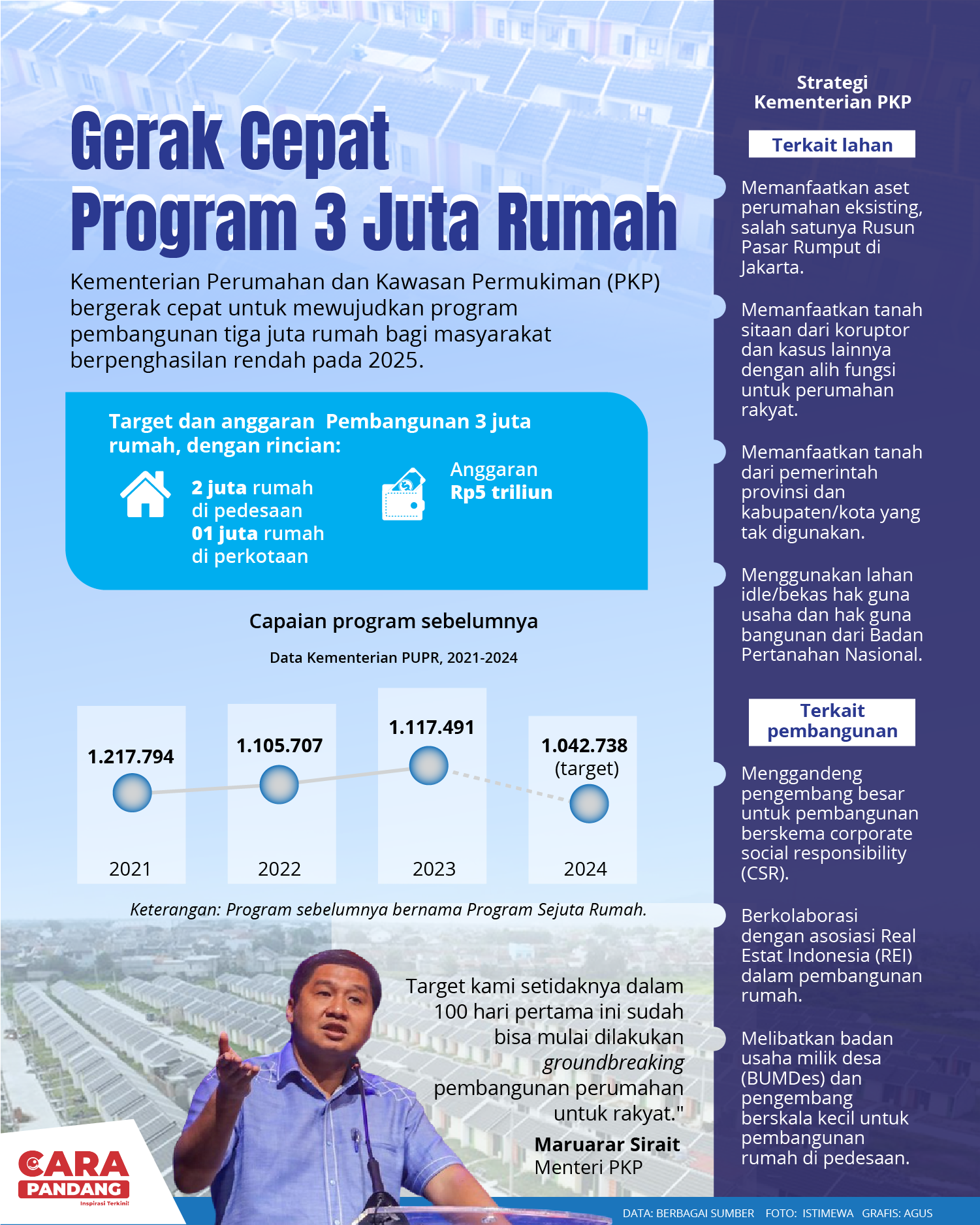 CARAPANDANG - Kementerian Perumahan dan Kawasan Permukiman (PKP) bergerak cepat untuk mewujudkan program pembangunan tiga juta rumah bagi masyarakat berpenghasilan rendah.