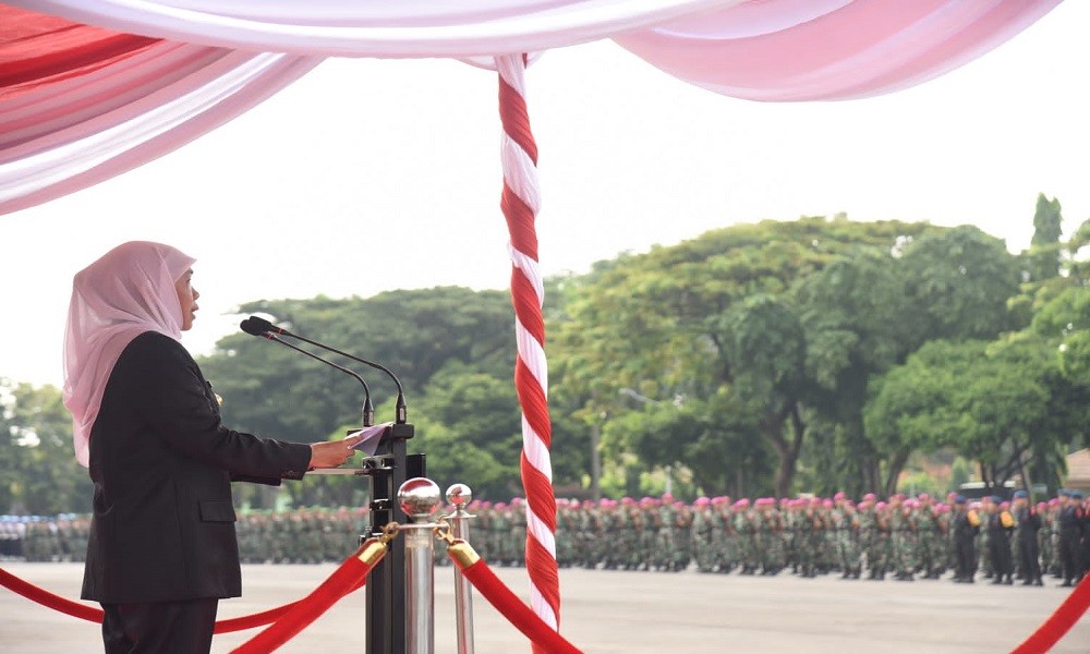 Gubernur Jawa Timur Khofifah Indar Parawansa memimpin apel Gelar Pasukan Operasi Ketupat Tahun 2023 yang digelar di Halaman Makodam V Brawijaya, Surabaya, Senin (17/4/2023).