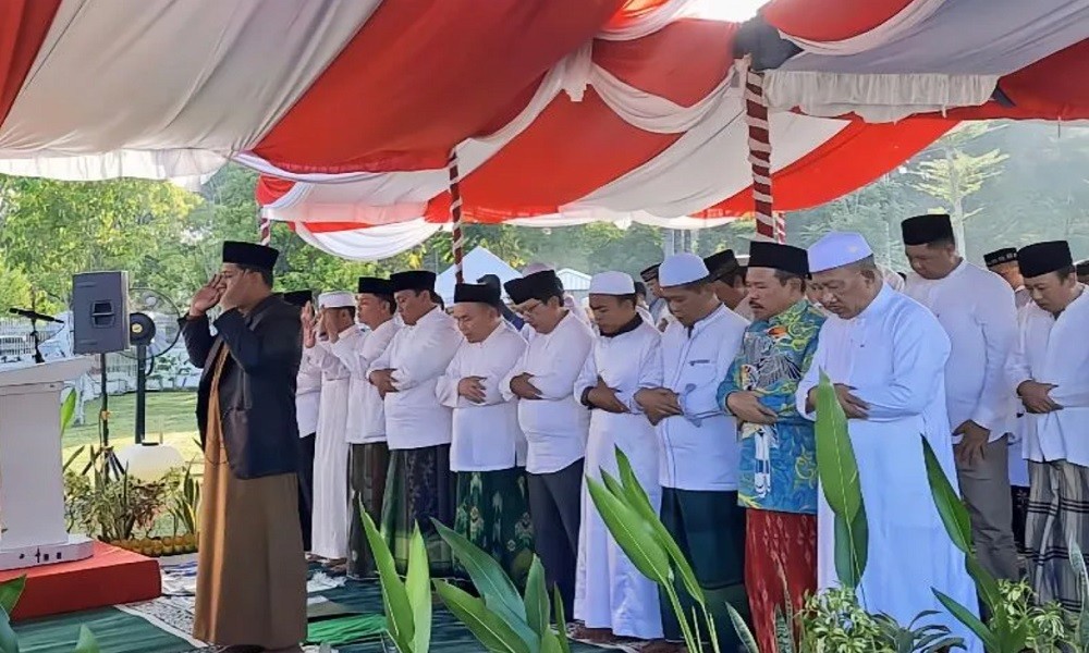 Gubernur Sugianto Sabran bersama Ketua TP PKK Kalimantan Tengah Yulistra Ivo menunaikan Shalat Idul Adha 1444 Hijriah di halaman Istana Isen Mulang Palangka Raya, Kamis, dengan imam dan khatib Rektor IAIN Palangka Raya Ahmad Dakhoir.