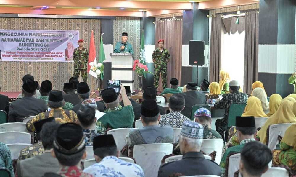 Gubernur Sumatera Barat, Mahyeldi Ansharullah menghadiri pengukuhan Pimpinan Daerah Muhammadiyah (PDM) dan Pimpinan Daerah Aisyiyah (PDA) Kota Bukittinggi Periode 2023-2027 di di Aula Universitas Muhammadiyah Sumatera Barat (UM Sumbar) Bukittinggi, Sabtu,