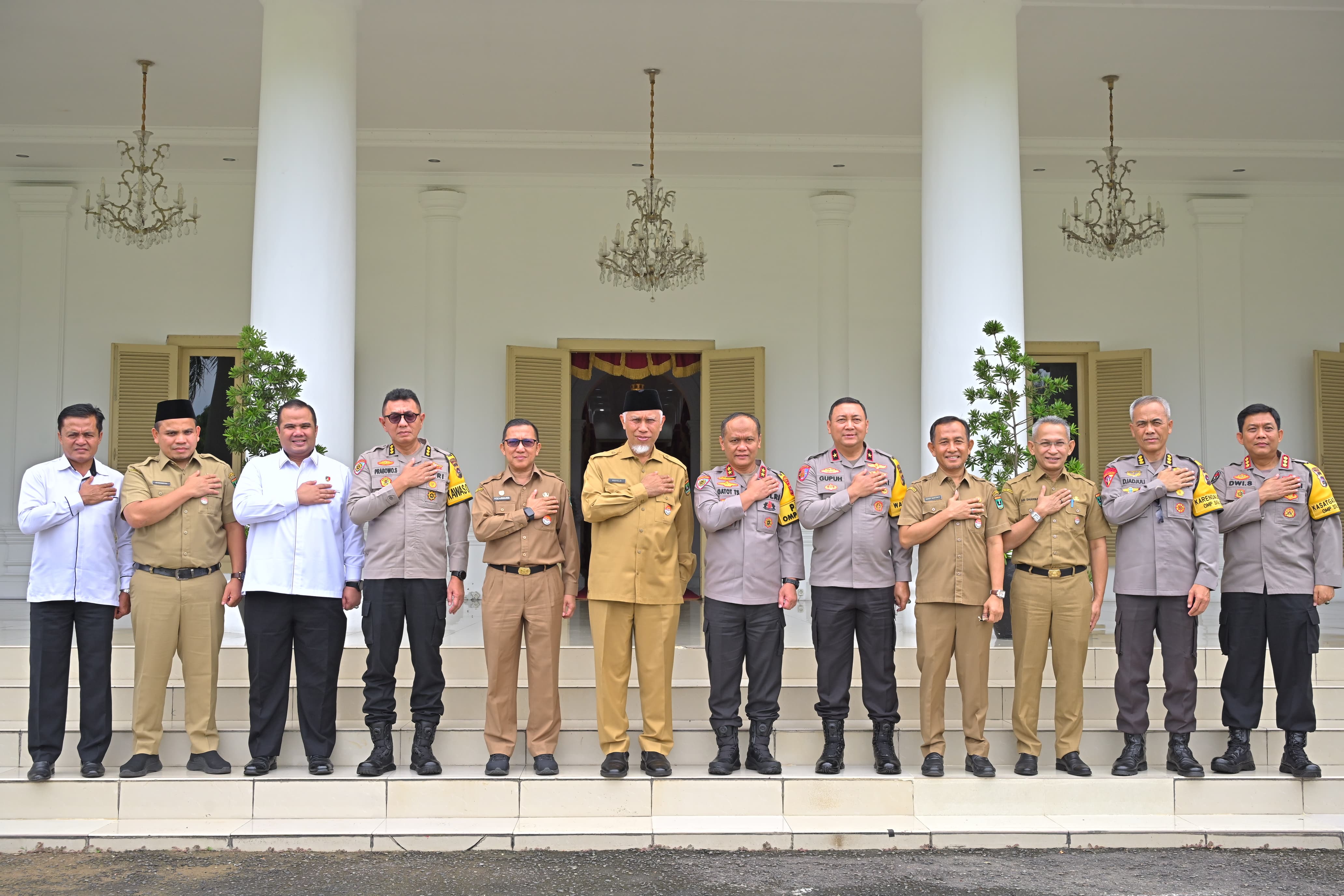 SUMBAR, CARAPANDANG - Gubernur Sumatera Barat (Sumbar), Mahyeldi Ansharullah, menerima kunjungan silaturrahim Kapolda Sumbar, Irjen Pol Gatot Tri Suryanta beserta jajaran di Istana Gubernuran, Senin (13/01/2025). Kedua pihak membahas penguatan sinergi untuk mendukung keamanan, kenyamanan, serta pembangunan yang berkelanjutan di Sumbar.