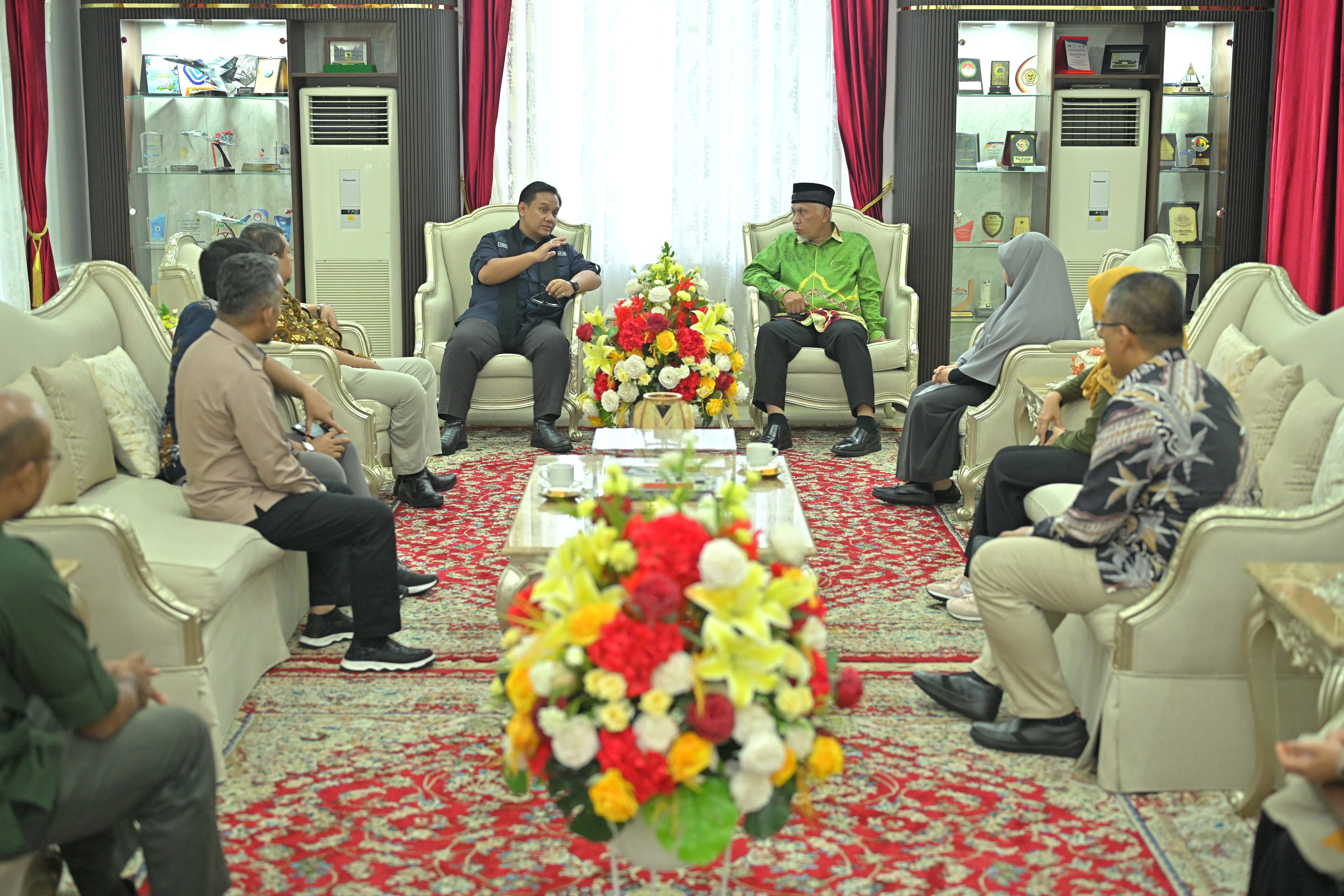 SUMBAR, CARAPANDANG - Gubernur Sumatera Barat (Sumbar) Mahyeldi Ansharullah menerima Kunjungan Kerja (Kunker) Anggota Ombudsman Republik Indonesia (Ombudsman RI), Yeka Hendra Fatika di Istana Gubernuran Sumbar, Kamis (15/8/2024). Keduanya lantas berdiskusi terkait permasalahan pelayanan publik perkelapasawitan antara PT. Laras Inter Nusa (PT LIN) dengan Koperasi Produsen Plasma Masyarakat Adat Kinali (KPP MAK) Kabupaten Pasaman Barat.