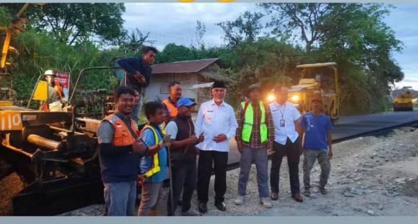 SUMBAR, CARAPANDANG - Gubernur Sumatera Barat (Sumbar), Mahyeldi Ansharullah meninjau langsung pengerjaan perbaikan ruas jalan Manggopoh - Padang luar, segmen Simpang Padang Luar - Simpang Balingka yang tengah dikerjakan Dinas Bina Marga Cipta Karya dan Tata Ruang (BMCKTR) Provinsi Sumbar.