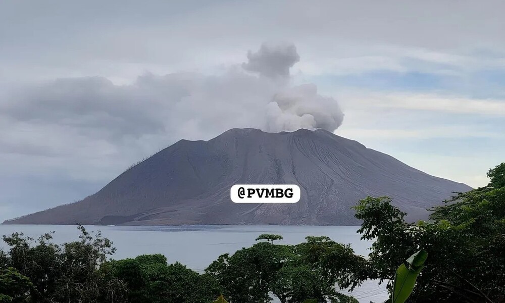 CARAPANDANG - Gumpalan asap tipis berwarna putih kelabu membumbung setinggi 200 meter dari pusat kawah Gunung Ruang yang terletak di Kabupaten Sitaro, Sulawesi Utara.