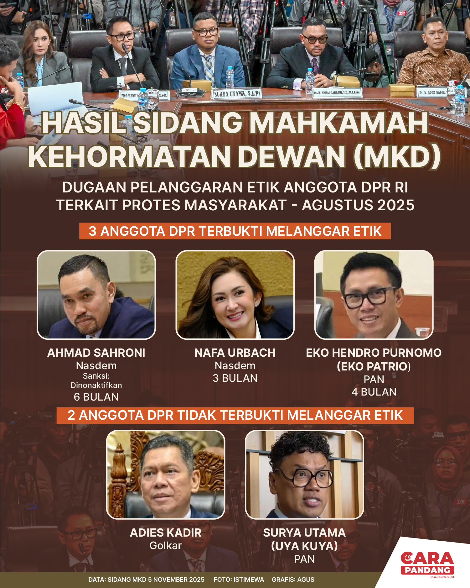 Beranda Infografis Hasil Sidang MKD DPR RI Infografis Hasil Sidang MKD DPR RI Penulis Amira Izzati - 06 November 2025 11:34 0 Hasil Sidang MKD DPR RI Tags Berita Sebelumnya Biaya Haji 2026 Turun Berita Berikutnya Indonesia Dalam Dilema Misi Perdamaian Dunia LEAVE A REPLY Cancel reply Comment: Please enter your comment! Name:* Please enter your name here Email:* You have entered an incorrect email address! Please enter your email address here Website: Save my name, email, and website in this browser for the next time I comment. Berita Teratas Kisah Ajaib Nabi Sulaiman dan Anak yang Berbakti kepada Orang Tua 8 Cara Merawat Kucing Kesayangan Agar Tubuhnya Selalu Sehat Minuman yang Mampu Redakan Batuk yang Menganggu Manfaat Ajaib Bawang Putih Bagi Kesehatan 8 Cara Menjaga Kesehatan Gigi dan Mulut yang Efektif Berita Terkait Berita Terkait Wajah Baru PP Tunas: Garda Terdepan Perlindungan Anak Indonesia Zoel Rachman - 31 Maret 2026 09:42 MBG 5 Hari Sepekan Masih Wacana Maliq - 30 Maret 2026 11:49 Presiden Ingin Semua Kendaraan Dikonversi ke Listrik Maliq - 30 Maret 2026 11:48 Kewaijiban PSE Terhadap Pengguna Anak Maliq - 30 Maret 2026 11:15