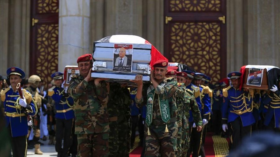 Upacara berlangsung Senin (1/9/2025) di Masjid Al-Shaab, Sanaa. Dua belas peti mati berbalut bendera dipajang, sementara pasukan bersenjata Houthi berjaga ketat.