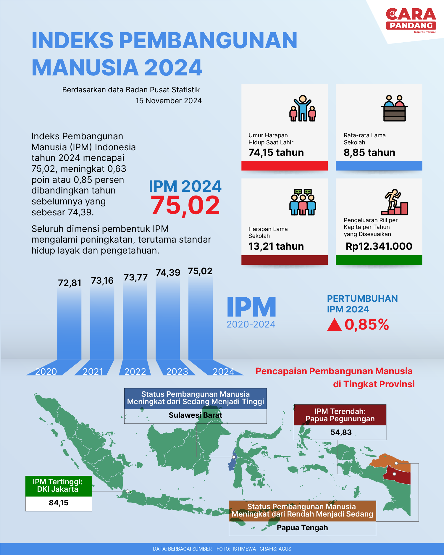 CARAPANDANG - Indeks Pembangunan Manusia (IPM) Indonesia tahun 2024 mencapai 75,02, meningkat 0,63 poin atau 0,85 persen dibandingkan tahun sebelumnya yang sebesar 74,39.