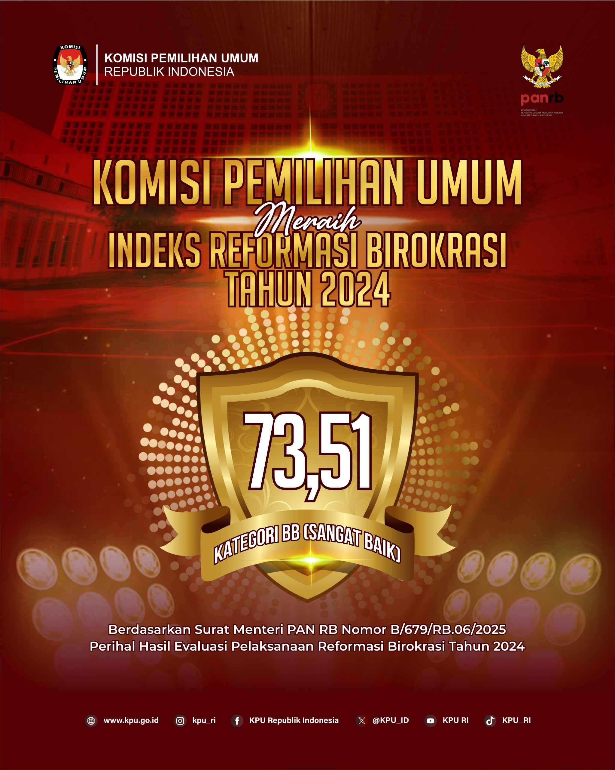 CARAPANDANG - Prestasi kembali ditorehkan Komisi Pemilihan Umum (KPU) yang berhasil meningkatkan indeks Reformasi Birokrasi (RB) Tahun 2024 menjadi 73,51 dengan predikat BB. Sebelumnya pada 2023, indeks RB KPU berada pada angka 69,76 dengan predikat B. Indeks Reformasi Birokrasi sendiri menggambarkan sejauh mana perbaikan tata kelola pemerintahan telah dilaksanakan oleh instansi pemerintah yang bertujuan pada pemerintahan yang efektif, efisien, bersih dari Korupsi, Kolusi dan Nepotisme (KKN) dan memiliki pelayanan publik yang berkualitas.