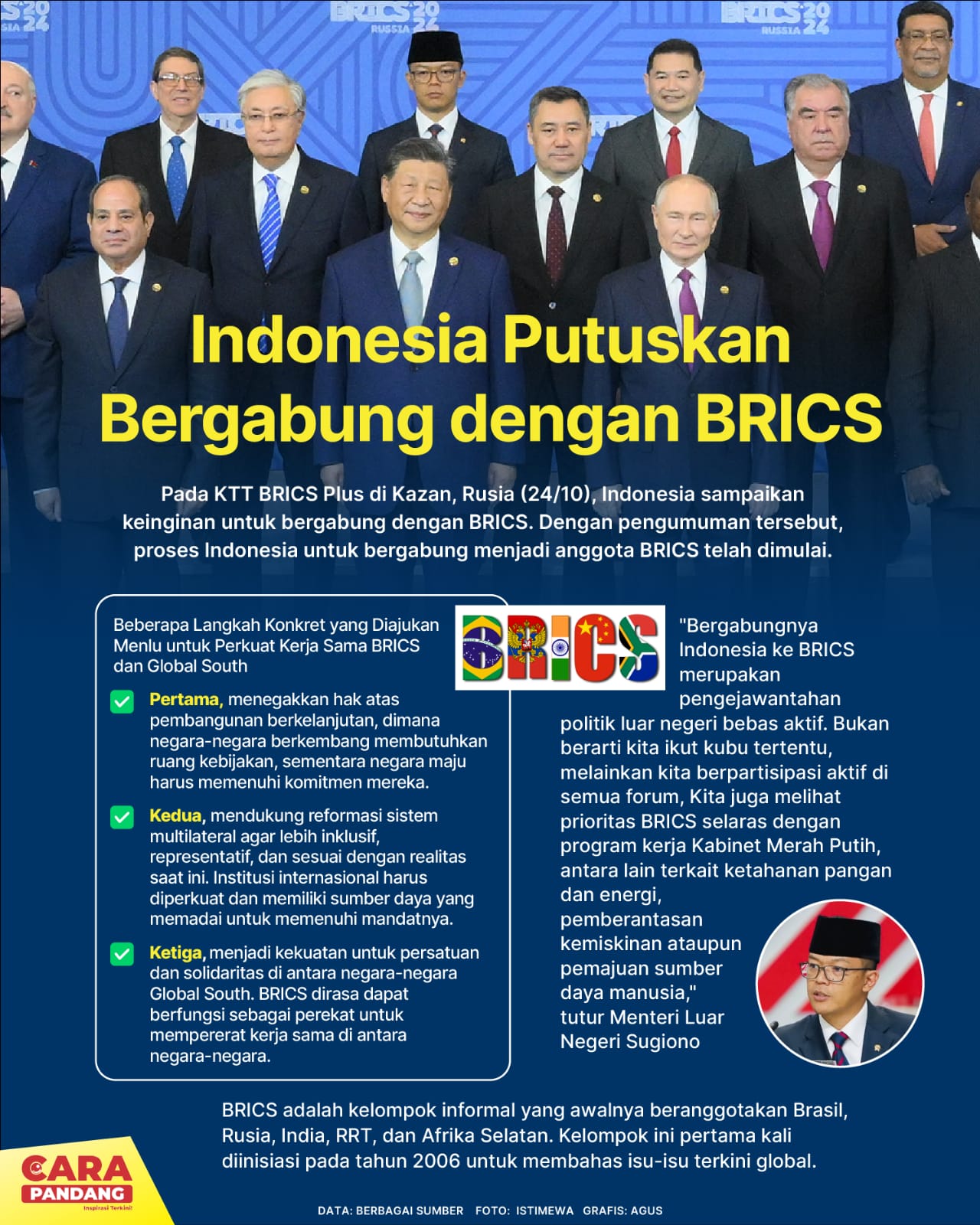 CARAPANDANG - Indonesia sampaikan keinginan untuk bergabung dalam BRICS dalam pertemuan KTT BRICS Plus di Kazan, Rusia (24/10). Dengan pengumuman tersebut, proses Indonesia untuk bergabung menjadi anggota BRICS telah dimulai.