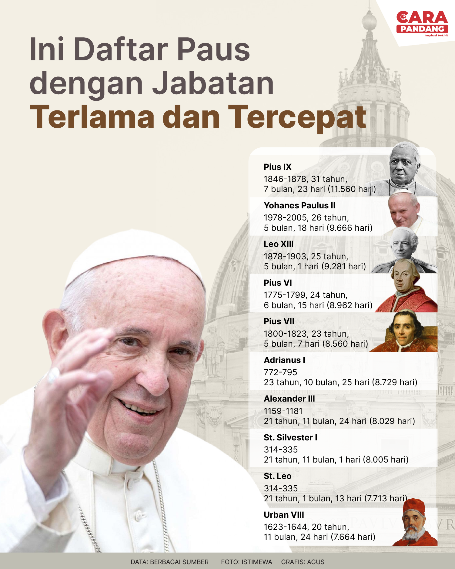 CARAPANDANG.COM - Ini Daftar Paus dengan Jabatan Terlama dan Tercepat.