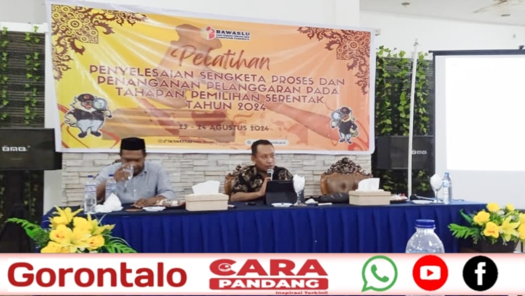 CARAPANDANG - Anggota KPU Kabupaten Pohuwato Iskandar Ibrahim jadi pemateri dalam kegiatan Bawaslu Pohuwato dalam rangka Pelatihan Penyesuaian Sengketa Proses dan Penanganan Pelanggan pada Tahapan Pemilihan Serentak Tahun 2024.