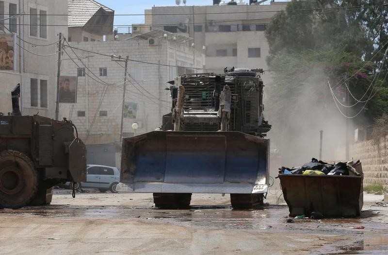 Sebuah kendaraan militer terlihat dalam sebuah operasi Israel di Kota Jenin, Tepi Barat bagian utara, pada 28 Agustus 2024. (Xinhua/Nidal Eshtayeh)