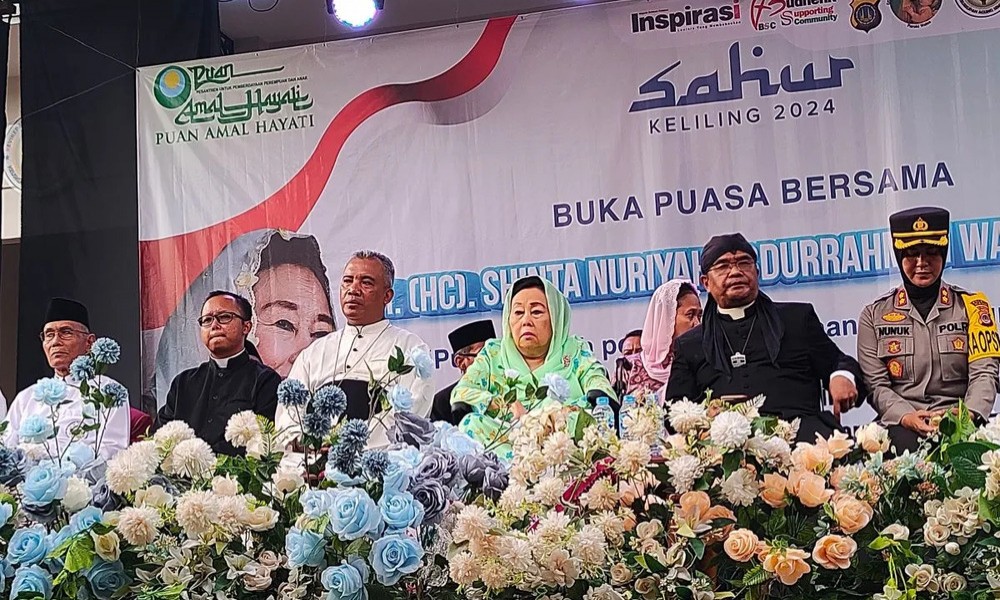 CARAPANDANG - Istri Presiden Republik Indonesia keempat KH Abdurrahman Wahid atau Gus Dur, Sinta Nuriyah berbuka bersama dengan umat lintas agama, difabel dan kaum marjinal di Kompleks Gereja Santa Maria Bunda Penasihat Baik Wates, Kabupaten Kulon Progo, Daerah Istimewa Yogyakarta (DIY).