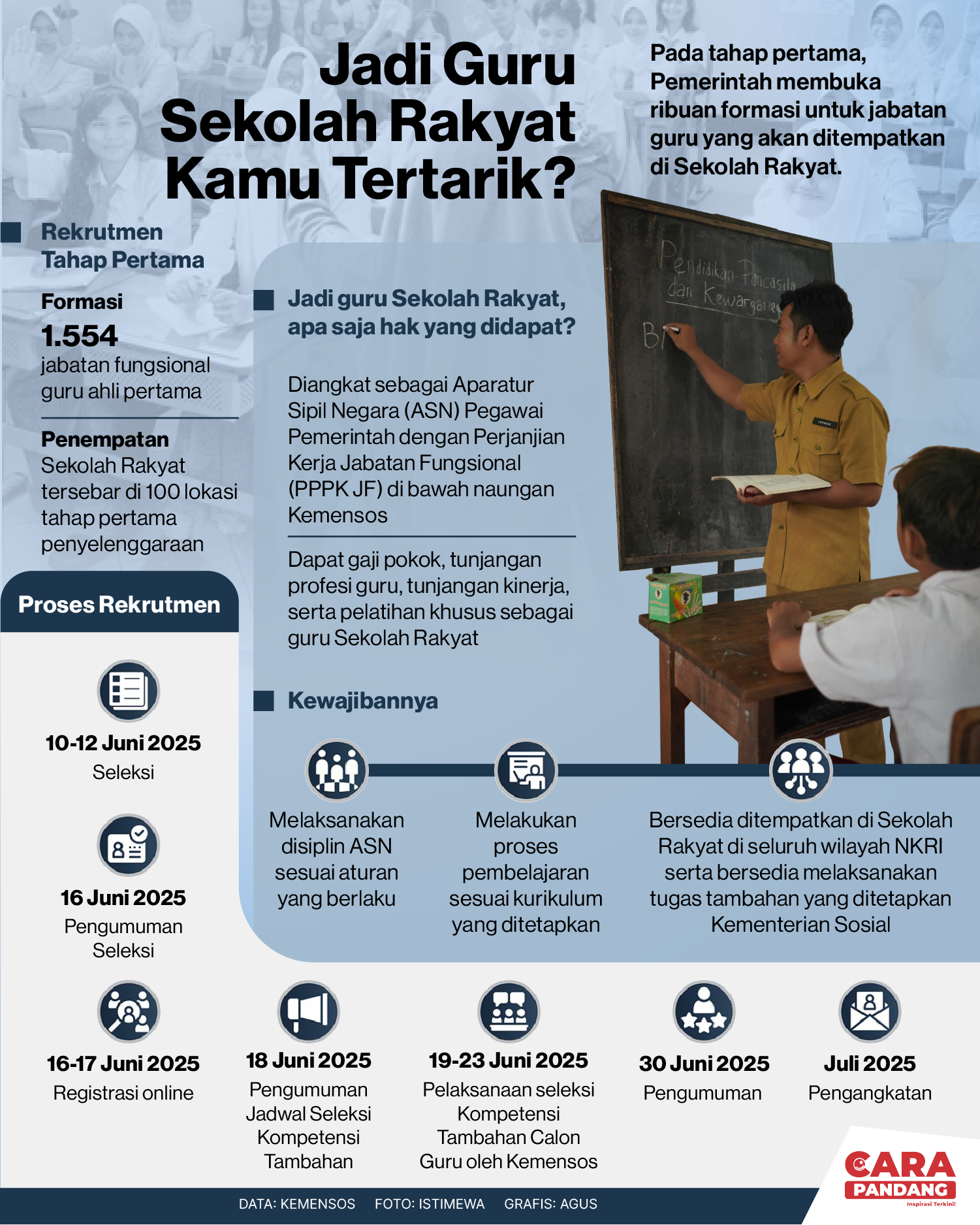 Beranda Infografis Jadi Guru Sekolah Rakyat, Kamu Tertarik? Infografis Jadi Guru Sekolah Rakyat, Kamu Tertarik? Penulis Amira Izzati - 14 Juni 2025 19:35 0 Jadi Guru Sekolah Rakyat, Kamu Tertarik? Tags Berita Sebelumnya Gubernur Mahyeldi Lantik Sejumlah Pejabat Pimpinan Tinggi Pratama di Lingkungan Pemprov Sumbar Berita Berikutnya Indonesia Dalam Dilema Misi Perdamaian Dunia LEAVE A REPLY Cancel reply Comment: Please enter your comment! Name:* Please enter your name here Email:* You have entered an incorrect email address! Please enter your email address here Website: Save my name, email, and website in this browser for the next time I comment. Berita Teratas Kisah Ajaib Nabi Sulaiman dan Anak yang Berbakti kepada Orang Tua 8 Cara Merawat Kucing Kesayangan Agar Tubuhnya Selalu Sehat Minuman yang Mampu Redakan Batuk yang Menganggu Manfaat Ajaib Bawang Putih Bagi Kesehatan 8 Cara Menjaga Kesehatan Gigi dan Mulut yang Efektif Berita Terkait Berita Terkait Wajah Baru PP Tunas: Garda Terdepan Perlindungan Anak Indonesia Zoel Rachman - 31 Maret 2026 09:42 MBG 5 Hari Sepekan Masih Wacana Maliq - 30 Maret 2026 11:49 Presiden Ingin Semua Kendaraan Dikonversi ke Listrik Maliq - 30 Maret 2026 11:48 Kewaijiban PSE Terhadap Pengguna Anak Maliq - 30 Maret 2026 11:15