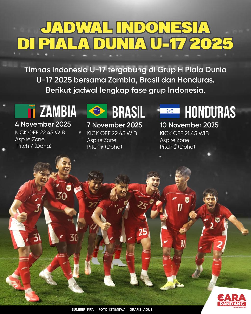 Beranda Infografis Jadwal Indonesia di Piala Dunia U17 2025 Infografis Jadwal Indonesia di Piala Dunia U17 2025 Penulis Amira Izzati - 29 Oktober 2025 13:24 0 Jadwal Indonesia di Piala Dunia U17 2025 Tags Berita Sebelumnya Payakumbuh Capai Indeks Elektronifikasi Transaksi 96,3 Persen, Lampaui Rata-Rata Nasional Berita Berikutnya Indonesia Dalam Dilema Misi Perdamaian Dunia LEAVE A REPLY Cancel reply Comment: Please enter your comment! Name:* Please enter your name here Email:* You have entered an incorrect email address! Please enter your email address here Website: Save my name, email, and website in this browser for the next time I comment. Berita Teratas Kisah Ajaib Nabi Sulaiman dan Anak yang Berbakti kepada Orang Tua 8 Cara Merawat Kucing Kesayangan Agar Tubuhnya Selalu Sehat Minuman yang Mampu Redakan Batuk yang Menganggu Manfaat Ajaib Bawang Putih Bagi Kesehatan 8 Cara Menjaga Kesehatan Gigi dan Mulut yang Efektif Berita Terkait Berita Terkait Wajah Baru PP Tunas: Garda Terdepan Perlindungan Anak Indonesia Zoel Rachman - 31 Maret 2026 09:42 MBG 5 Hari Sepekan Masih Wacana Maliq - 30 Maret 2026 11:49 Presiden Ingin Semua Kendaraan Dikonversi ke Listrik Maliq - 30 Maret 2026 11:48 Kewaijiban PSE Terhadap Pengguna Anak Maliq - 30 Maret 2026 11:15