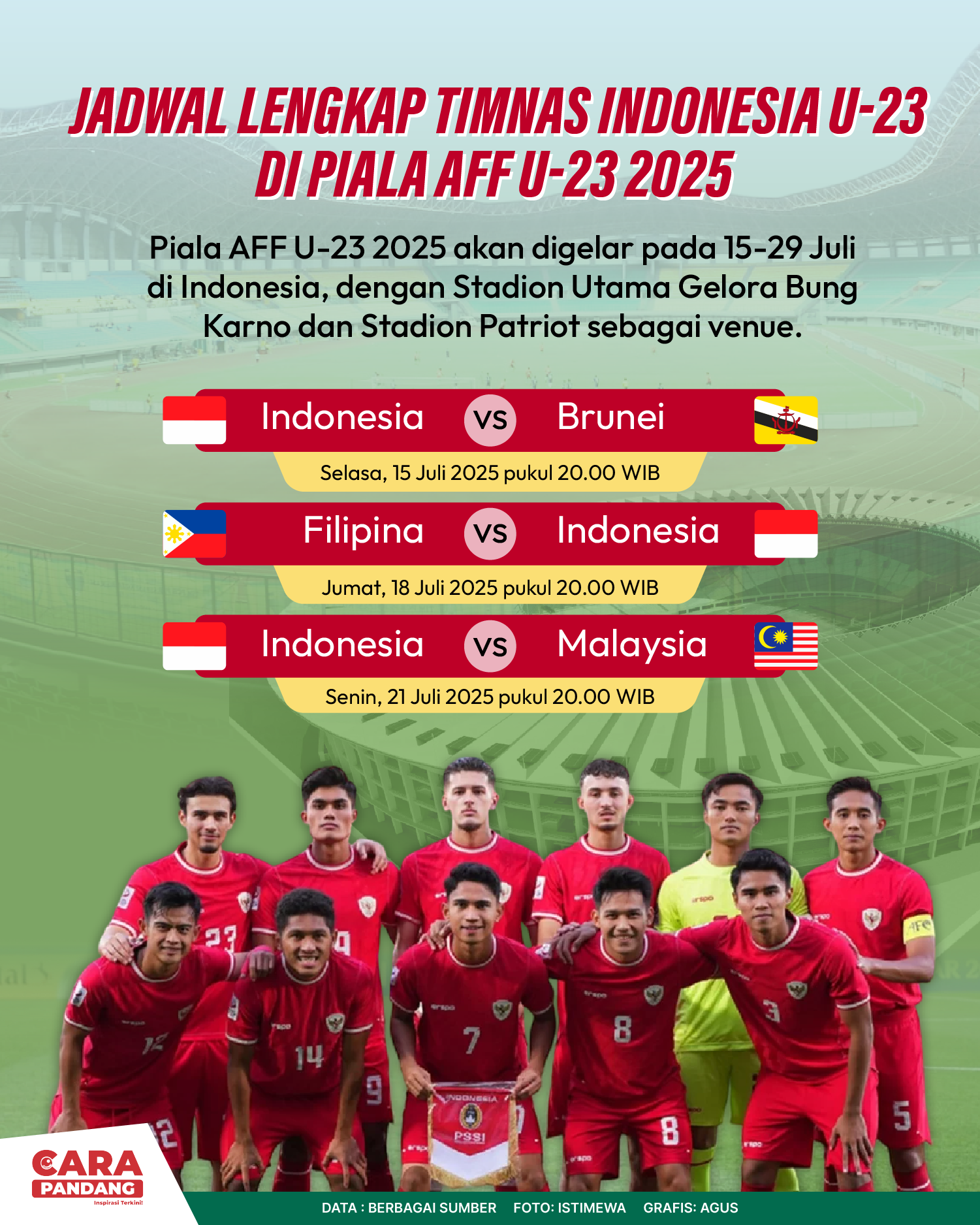 Beranda Infografis Jadwal Lengkap Timnas Indonesia U-23 Infografis Jadwal Lengkap Timnas Indonesia U-23 Jadwal Lengkap Timnas Indonesia U-23. Penulis Edo Soeryadi - 15 Juli 2025 13:50 0 CARAPANDANG.COM - Jadwal Lengkap Timnas Indonesia U-23. Tags Infografik Timnas Indonesia U23 Berita Sebelumnya Trump Sebut AS akan Kirim Senjata ke Ukraina Via NATO, Ancam "Tarif Berat" Terhadap Rusia Berita Berikutnya Indonesia Dalam Dilema Misi Perdamaian Dunia LEAVE A REPLY Cancel reply Comment: Please enter your comment! Name:* Please enter your name here Email:* You have entered an incorrect email address! Please enter your email address here Website: Save my name, email, and website in this browser for the next time I comment. Berita Teratas Kisah Ajaib Nabi Sulaiman dan Anak yang Berbakti kepada Orang Tua 8 Cara Merawat Kucing Kesayangan Agar Tubuhnya Selalu Sehat Minuman yang Mampu Redakan Batuk yang Menganggu Manfaat Ajaib Bawang Putih Bagi Kesehatan 8 Cara Menjaga Kesehatan Gigi dan Mulut yang Efektif Berita Terkait Berita Terkait Wajah Baru PP Tunas: Garda Terdepan Perlindungan Anak Indonesia Zoel Rachman - 31 Maret 2026 09:42 MBG 5 Hari Sepekan Masih Wacana Maliq - 30 Maret 2026 11:49 Presiden Ingin Semua Kendaraan Dikonversi ke Listrik Maliq - 30 Maret 2026 11:48 Kewaijiban PSE Terhadap Pengguna Anak Maliq - 30 Maret 2026 11:15