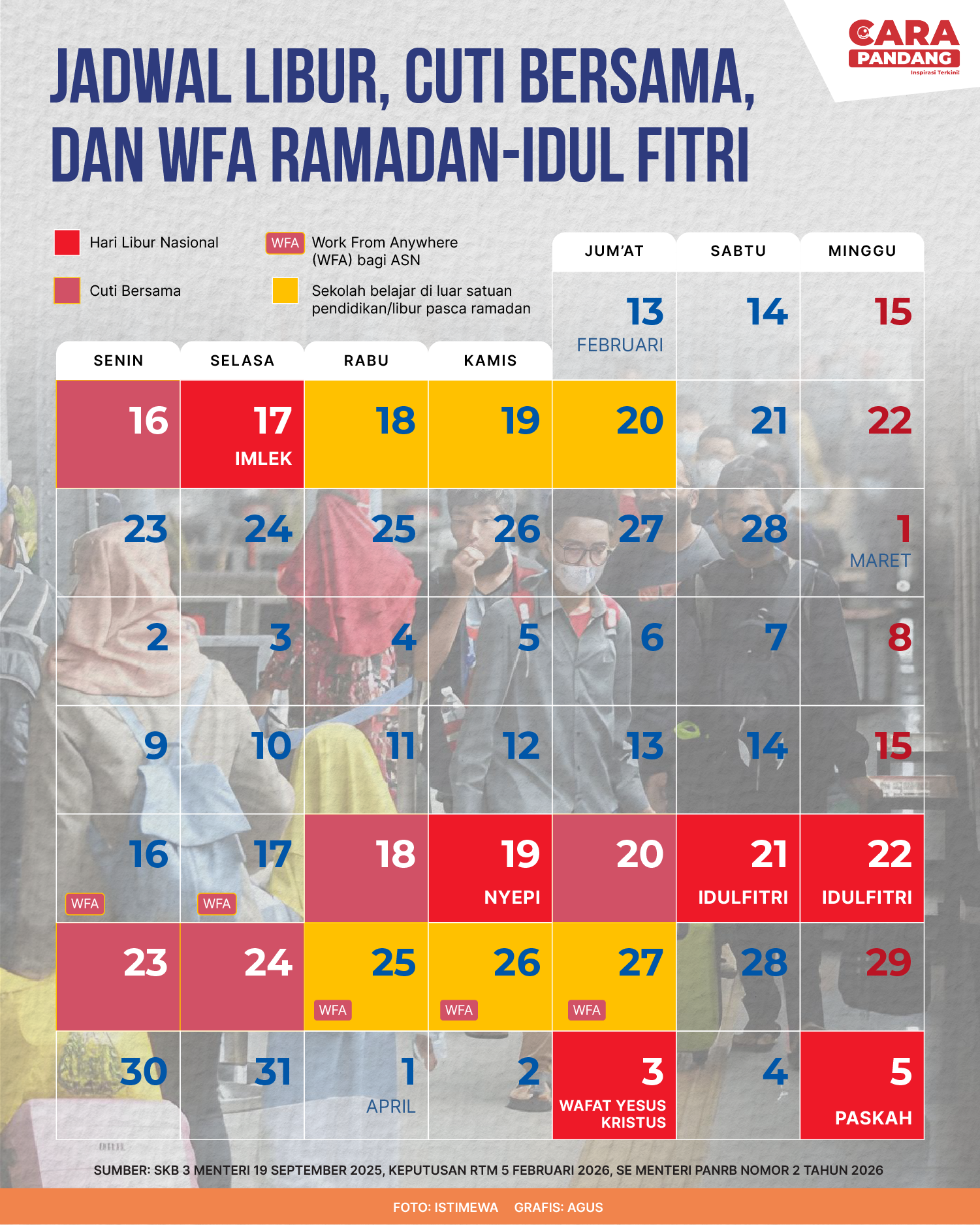 Beranda Infografis Jadwal Libur, Cuti Bersama, WFA Ramadan 2026 Infografis Jadwal Libur, Cuti Bersama, WFA Ramadan 2026 Penulis Amira Izzati - 16 Februari 2026 10:18 0 Jadwal Libur, Cuti Bersama, WFA Ramadan 2026 Tags Berita Sebelumnya Prakiraan Cuaca Indonesia 16 Februari 2026 Berita Berikutnya Indonesia Dalam Dilema Misi Perdamaian Dunia LEAVE A REPLY Cancel reply Comment: Please enter your comment! Name:* Please enter your name here Email:* You have entered an incorrect email address! Please enter your email address here Website: Save my name, email, and website in this browser for the next time I comment. Berita Teratas Kisah Ajaib Nabi Sulaiman dan Anak yang Berbakti kepada Orang Tua 8 Cara Merawat Kucing Kesayangan Agar Tubuhnya Selalu Sehat Minuman yang Mampu Redakan Batuk yang Menganggu Manfaat Ajaib Bawang Putih Bagi Kesehatan 8 Cara Menjaga Kesehatan Gigi dan Mulut yang Efektif Berita Terkait Berita Terkait Wajah Baru PP Tunas: Garda Terdepan Perlindungan Anak Indonesia Zoel Rachman - 31 Maret 2026 09:42 MBG 5 Hari Sepekan Masih Wacana Maliq - 30 Maret 2026 11:49 Presiden Ingin Semua Kendaraan Dikonversi ke Listrik Maliq - 30 Maret 2026 11:48 Kewaijiban PSE Terhadap Pengguna Anak Maliq - 30 Maret 2026 11:15