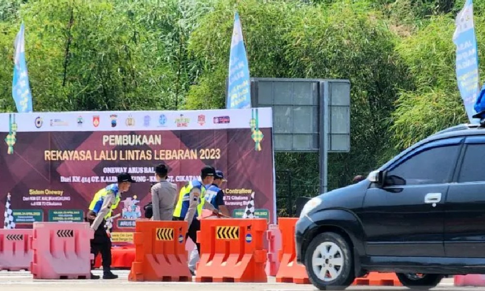 CARAPANDANG - Arus kendaraan dari arah barat atau Jakarta yang menuju gerbang Tol Kalikangkung Semarang, Jawa Tengah, mulai disterilkan menjelang pemberlakuan jalir satu arah (one way) arus balik Lebaran (Idul Fitri) 1444 Hijriah, Senin.