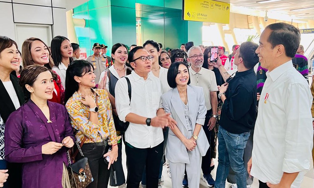 Tampak para pemengaruh yang mendampingi Jokowi, antara lain, Nirina Zubir, Prisia Nasution, Chelsea Islan, Lukman Sardi, Desta, Cak Lontong, dan lainnya.