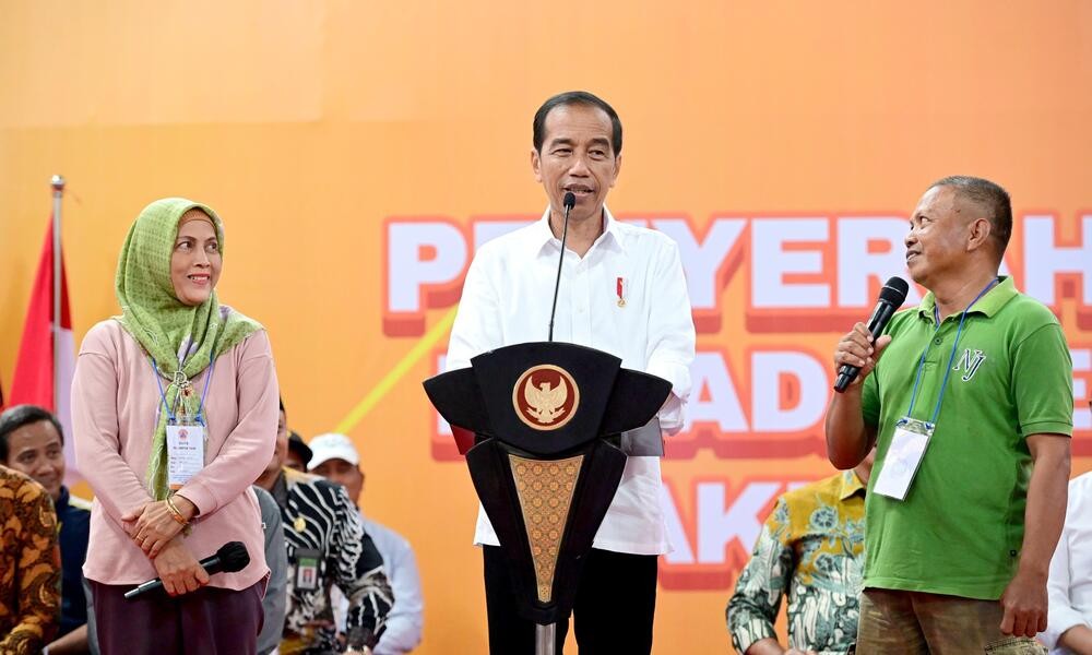 CARAPANDANG - Presiden Joko Widodo menyerahkan bantuan stimulan kepada petani gagal panen (puso) di GOR Bung Karno, Kabupaten Grobogan, Provinsi Jawa Tengah, pada Selasa, 23 Januari 2024. Dalam sambutannya, Presiden Jokowi berharap uang bantuan tersebut dapat segera diterima oleh para petani sehingga para petani bisa segera menanam padi.