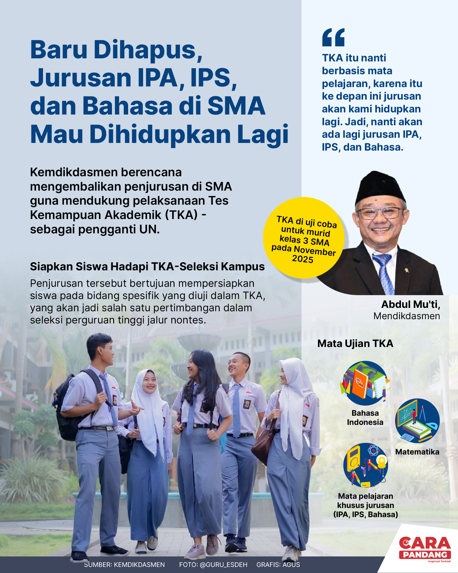 CARAPANDANG - Dengan pemberlakuan sistem penjurusan, siswa yang mengikuti tes kemampuan akademik (TKA)—pengganti ujian nasional—nantinya wajib mengikuti tes Bahasa Indonesia dan Matematika.