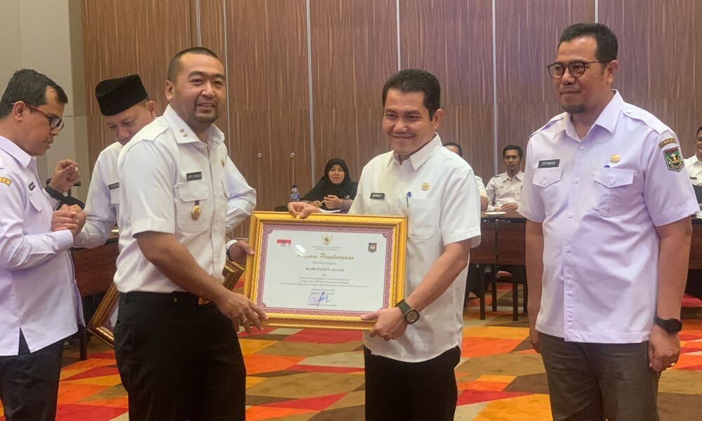 Penghargaan tersebut diserahkan langsung oleh Wakil Gubernur Sumatera Barat, Audy Joinaldy dan diterima okeh Asisten III Setdakab Agam, Adrinaldi pada Rapat Koordinasi Kepala Daerah di Grand Zuri Padang , Rabu (26/7).