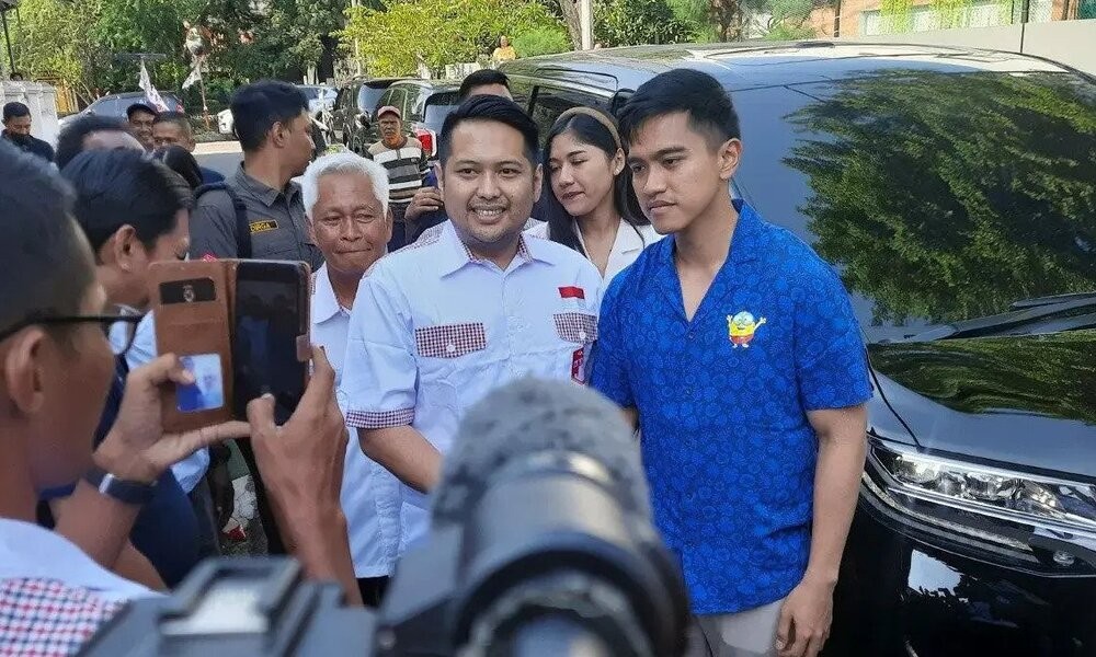 Kaesang tiba di markas Bara JP dengan ditemani istrinya, Erina Gudono, Anggota Dewan Pembina PSI Isyana Bagoes Oka, dan Sekretaris Jenderal (Sekjen) PSI Raja Juli Antoni.