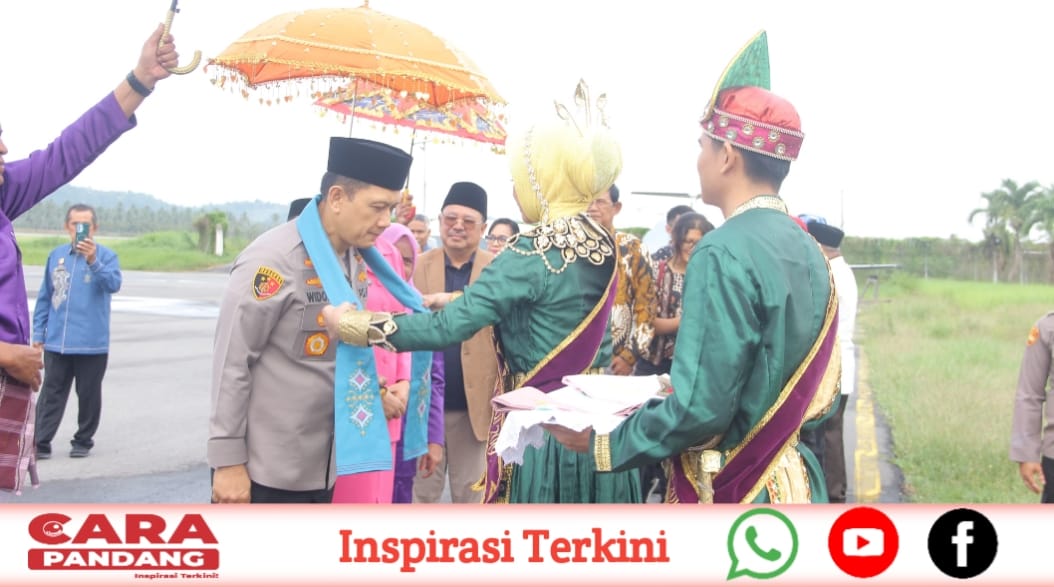 POHUWATO, CARAPANDANG - Kapolda Gorontalo Irjen Pol. Drs. Widodo, S.H., M.H. didampingi Ketua Bhayangkari Daerah Gorontalo Ny. Septiana Widodo resmi disambut dengan prosesi adat Mopotilolo saat tiba di Gorontalo. Kegiatan berlangsung khidmat di Bandara Lama Djalaludin, Kamis (21/08/2025).
