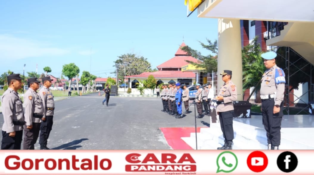 POHUWATO, CARAPANDANG - Kapolres Pohuwato AKBP Busroni, S.I.K., M.H. memimpin kegiatan pemasangan ban lengan Pamapta kepada para personel, bertempat di Lapangan Mapolres Pohuwato, Kamis, (16/10/2025).