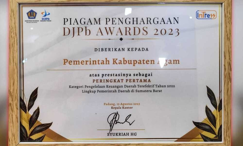 Ganjaran dalam bentuk penghargaan tersebut diterima Pemerintah kabupaten Agam sebagai peringkat pertama dalam kategori terefektif dalam pengelolaan keuangan daerah bersama dengan Pemerintah Kota Pariaman namun dalam kategori yang berbeda.