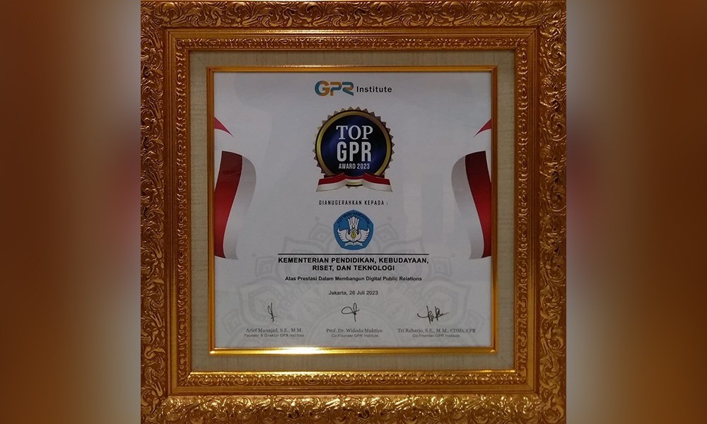 CARAPANDANG - Kementerian Pendidikan, Kebudayaan, Riset, dan Teknologi (Kemendikbudristek) berhasil meraih penghargaan dari Government Public Relations (GPR) Institute dalam TOP GPR Award & GPR Leader Award 2023. Kemendikbudristek memperoleh penghargaan dari TOP GPR Award 2023 dengan skor final 89,12 poin atas ‘Prestasi dalam Membangun Digital Public Relations’.