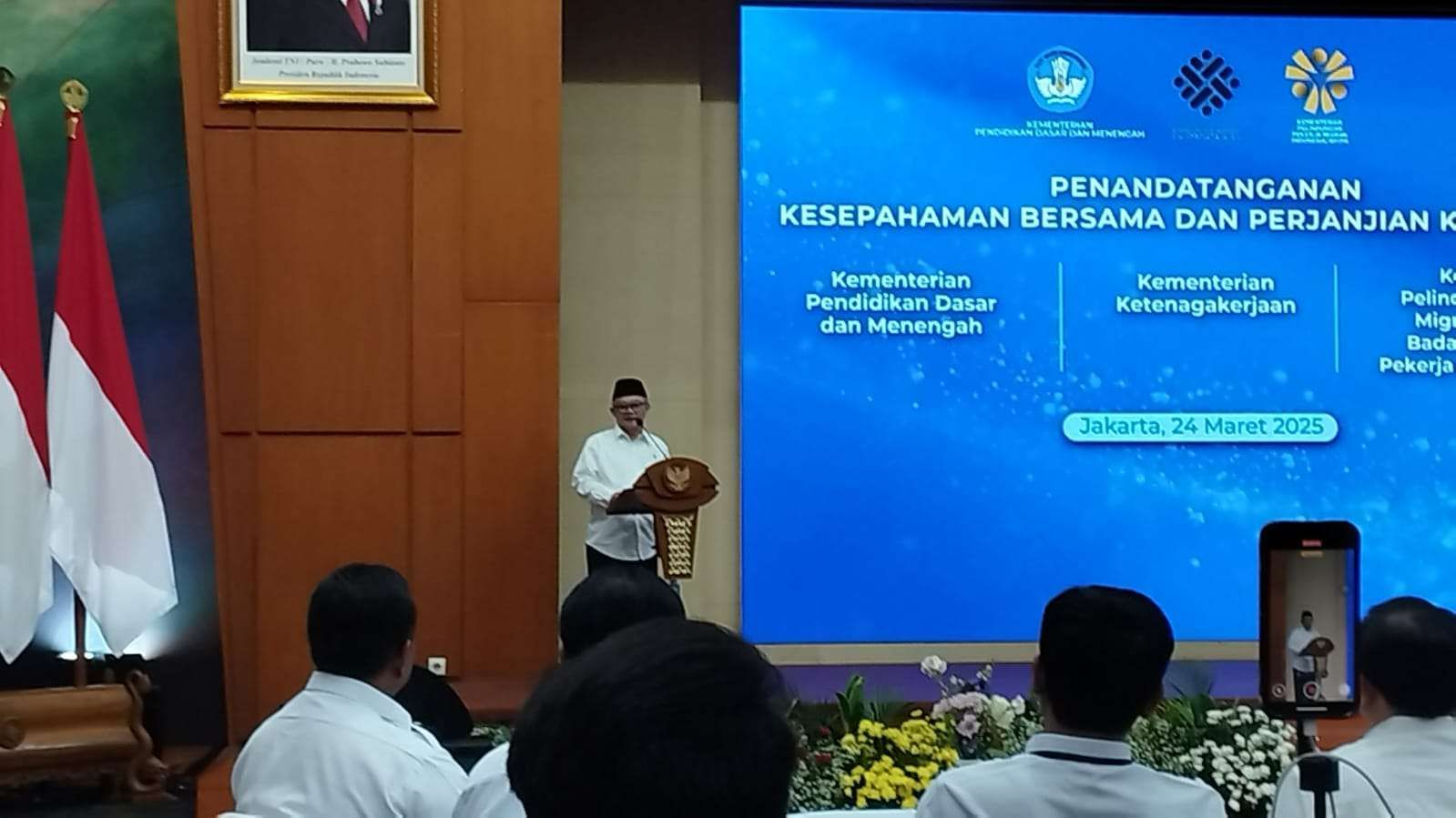 CARAPANDANG - Kementerian Pendidikan Dasar dan Menengah (Kemendikdasmen) menandatangani kerja sama dengan Kementerian Ketenagakerjaan dan Kementerian Perlindungan Pekerja Migran Indonesia. Penandatanganan kerja sama tersebut dilakukan di Kantor Kemendikdasmen, Senin (24/3/2025).